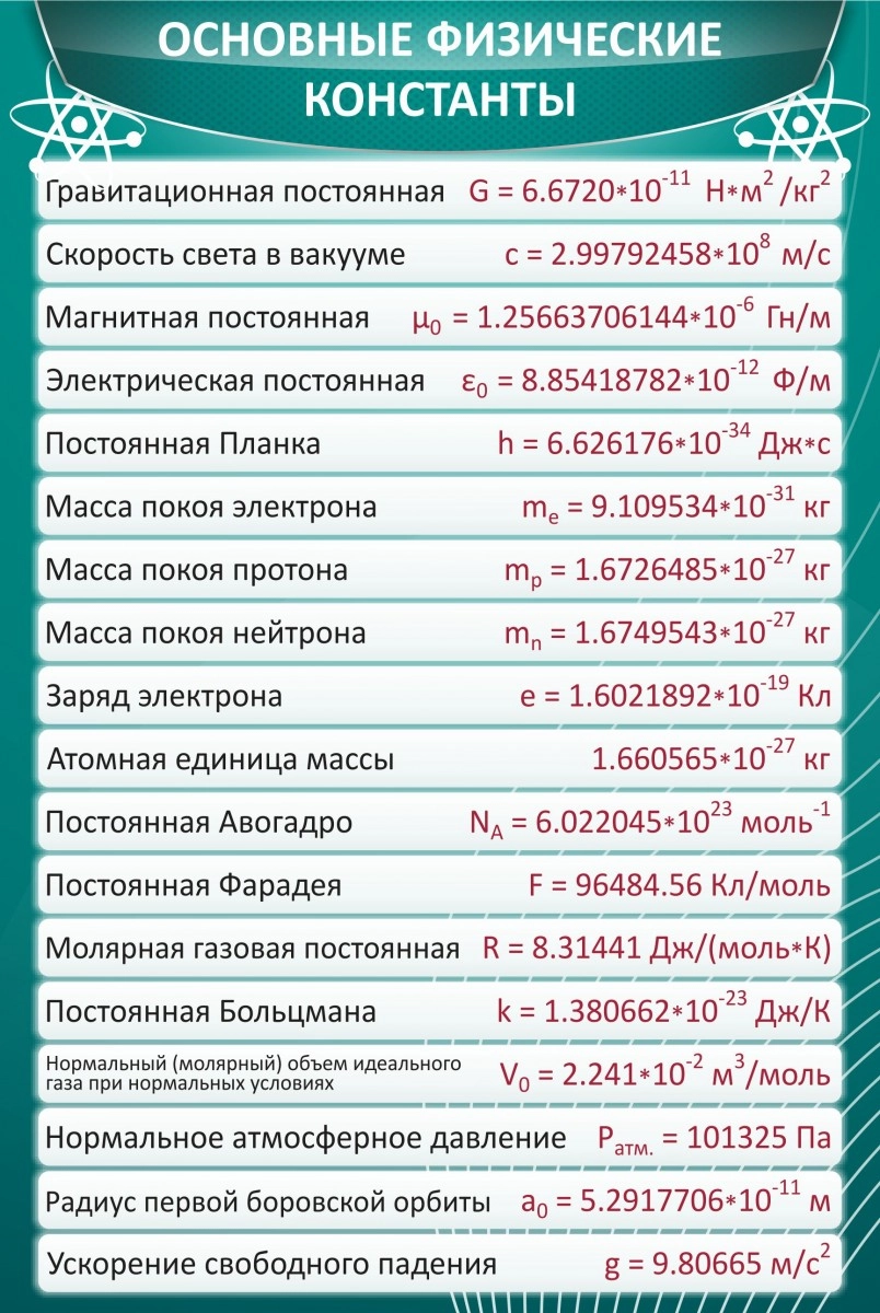 Сколько не понятных цифр для ученика появляется с предметом физики, в которых ему трудно не только разобраться, но и понять. Стенд «Основные физические константы» является современной и действующей подсказкой для понимания такой трудной темы. Каждый учитель сталкивался с такими школьниками, которые не осмеливаются подойти и спросить то, что они не смогли понять. Расположенный на видном месте стенд будет служить для них как опора для решения различных задач, что в скором времени увеличит их стремление к повышению знаний без помощи дополнительных подсказок. Стенд без затруднений можно перевешать в другое место, подобрав оптимальное расположение в кабинете для учеников.