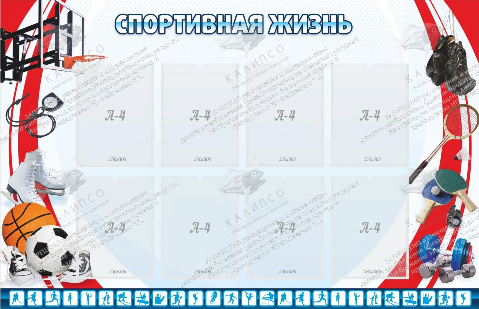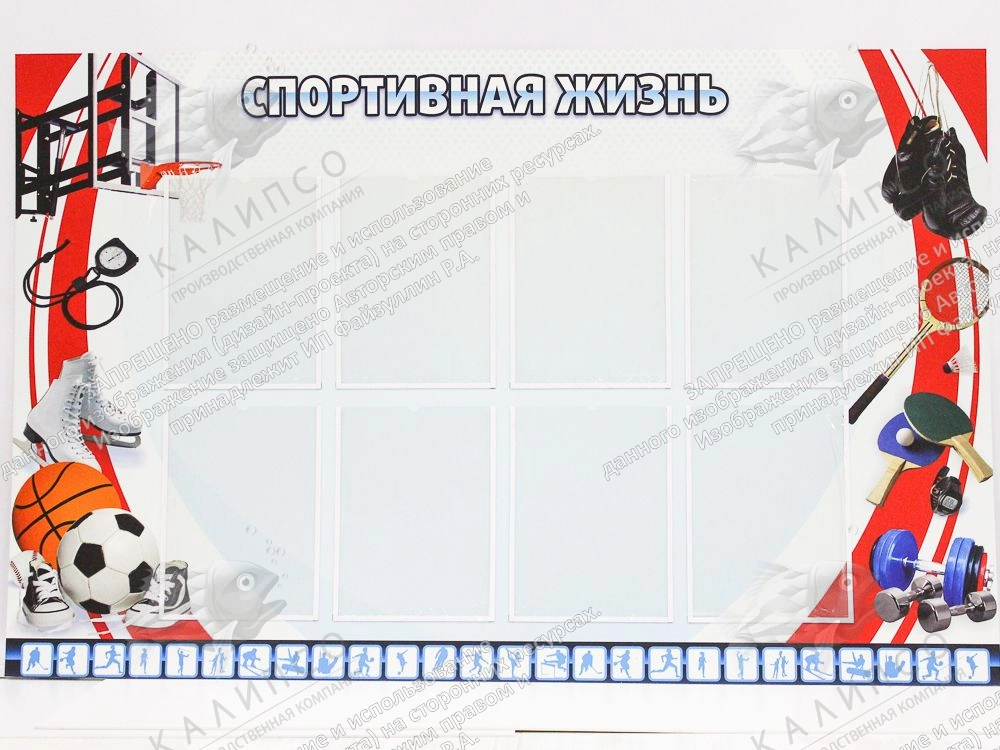 В стенах школьного учреждения рождаются не только гении, но и великие спортсмены, которым надо помогать развиваться и направлять. Стенд «Спортивная жизнь» сделан для того, чтобы руководители могли освещать спортивные мероприятия, рекорды школы, отличившихся спортсменов, а восемь карманов формата А4, расположенные на стенде, позволяют менять информацию по мере необходимости. Стенд оформлен ярко и красочно, что притягивает взгляды учащихся, а легкий материал стенда позволяет при необходимости перевозить его и крепить на двухсторонний скотч или небольшие саморезы на любую стену.