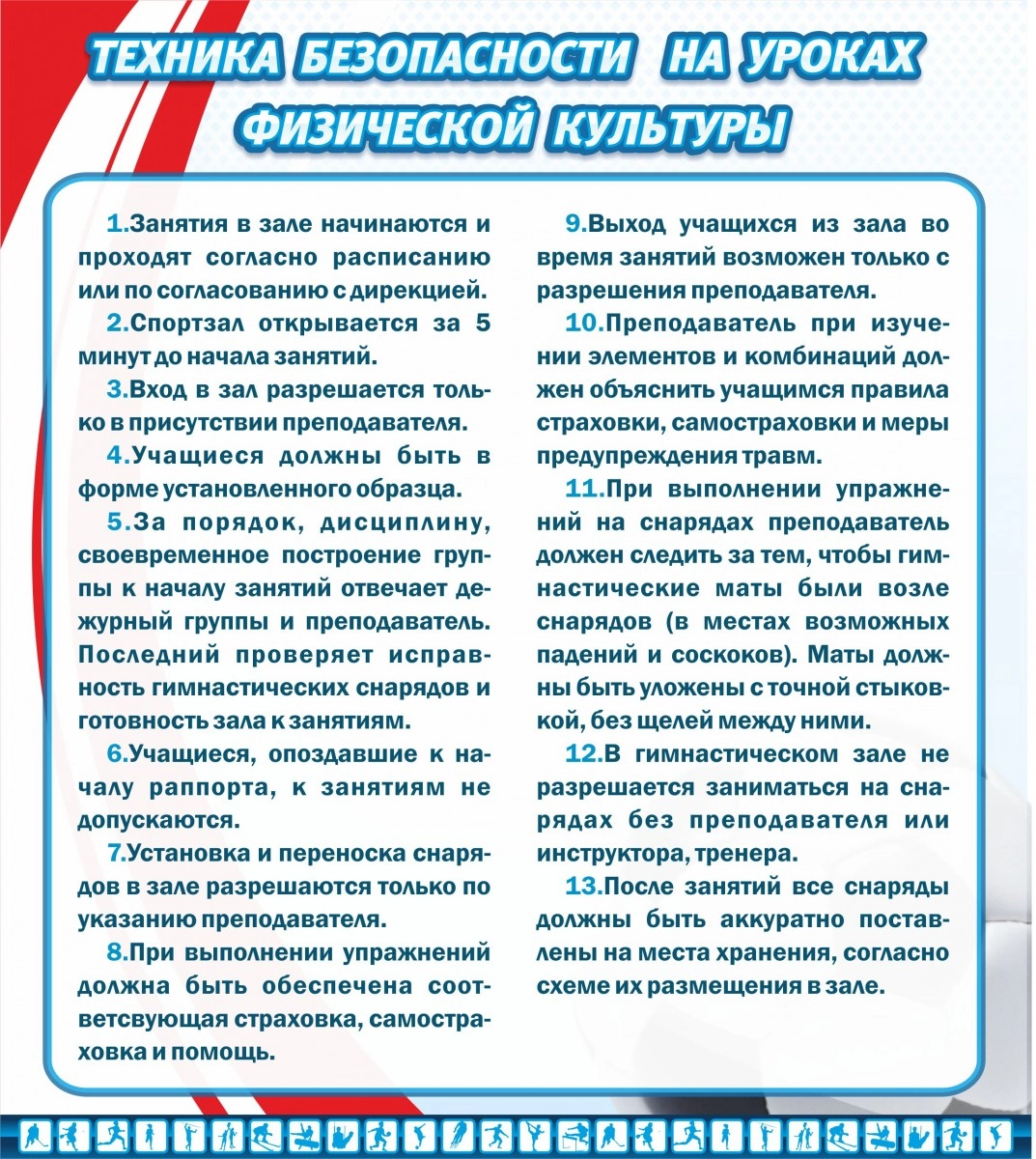 На уроках физкультуры преподаватели очень часто показывают и демонстрируют разнообразные спортивные нормы, при которых можно получить травму, поэтому знание техники безопасности на уроке физкультуры необходимы не только учителю, но и ученикам. Стенд «Техника безопасности на уроке физ.культуры» помогает учителю всегда напоминать детям о техники безопасности при нахождении в спорт зале. Фоновый дизайн сделан так, чтобы стенд выделялся и позволял запомнить место его расположения в кабинете. Стенд выполнен из качественного и легкого материала ПВХ, который без каких-то проблем крепится на двухсторонний скотч или небольшие саморезы на любую стену.