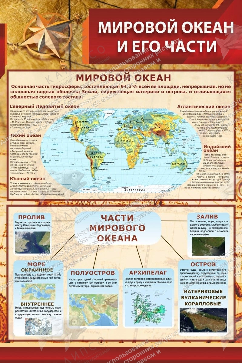 Мировой океан и его части- информационный стенд для кабинета географии. На нем ученики смогут найти нужную информацию про Мировой океан: определение, разделение на Северный Ледовитый океан, Тихий океан, Южный океан, Атлантический океан и Индейский океан, части мирового океана: проливы, моря, полуострова, острова, архипелаги и заливы. Яркие картинки и карта добавляют в стенд информативности. Красивая надпись "мировой океан и его части" привлечет внимание учеников, они не смогут пройти мимо стенда, не обратив на него внимания. Качество стенда на высоком уровне, а это значит, что он прослужит долгие годы.