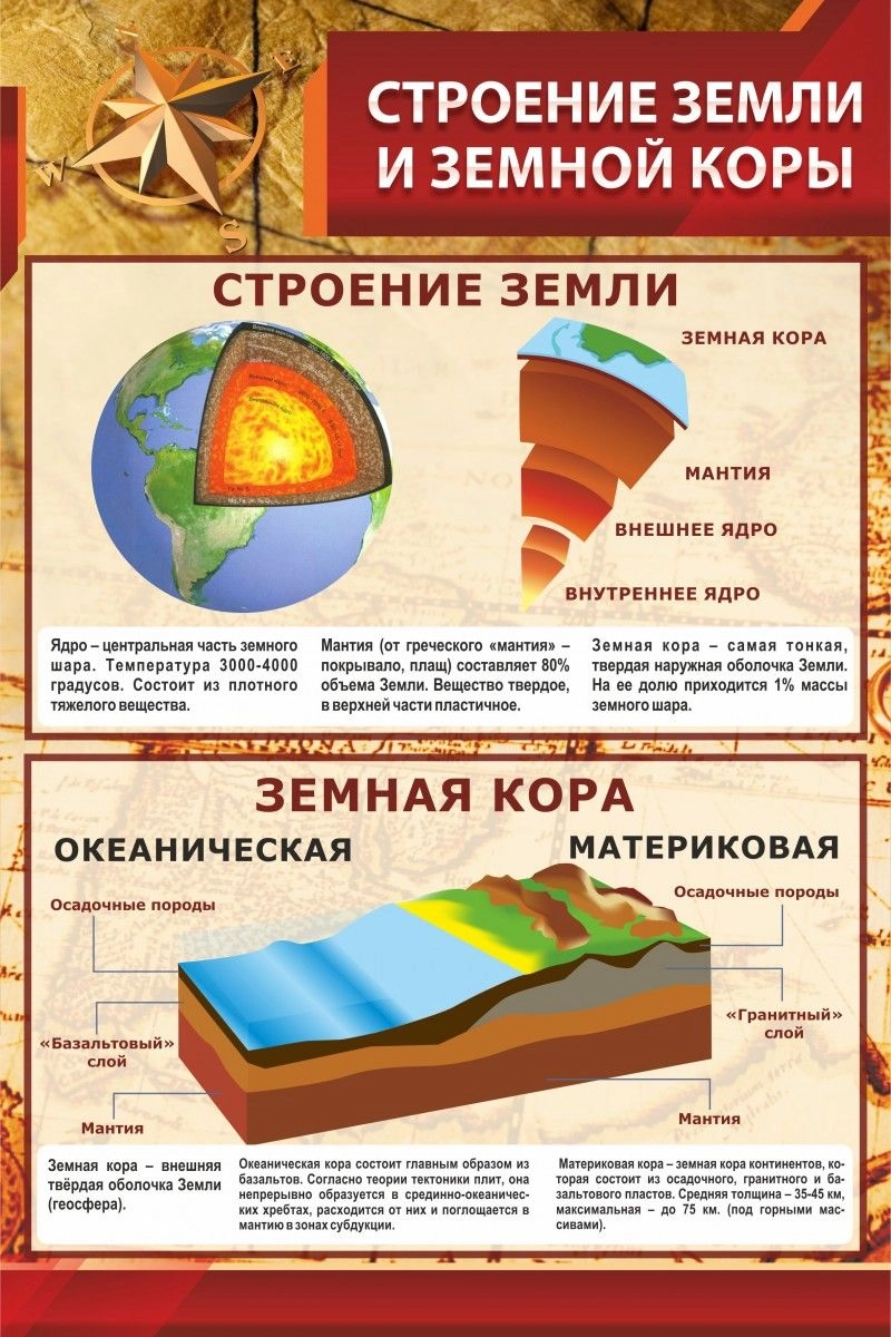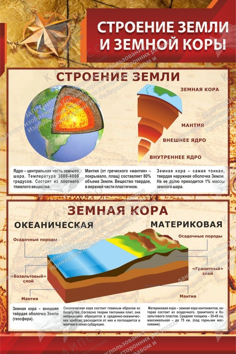 Удобный стенд для изучения земной коры и строения Земли. На нем представлены три изображения: Земли в разрезе, куска Земли и земной коры. Большой плюс данного стенда в том, что на нем не только подписан каждый слой, но и есть определения трудных и непонятных для учеников слов. Изображение земной коры разделено на два: океаническое и материковое строение. Качество стенда на высоком уровне. ПВХ- пластик, пленка с фотопечатью, и ламинирующая пленка продлит срок службы стенда, сохранив его первоначальное состояние на долгое время. Краска не поблекнет и не потускнеет. А приятный фон будет радовать глаз учителю долгое время.