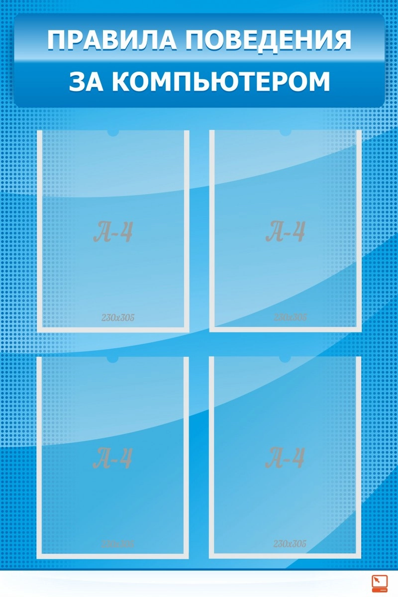 Прекрасный стенд, состоящий из четырех пустых карманов, которые можно заполнить основными правилами поведения за компьютером. Школьникам очень важно знать такие сведения. В ином случае, могут случиться досадные происшествия. Ведь бывает нечто страшнее, нежели падение компьютерной мышки либо клавиатуры. Для создания стенда были использованы три оттенка. Это – успокаивающий синий, приятный глазу голубой цвет и белоснежный оттенок. Стенд хорош тем, что существует возможность личного творчества, и указания самых необходимых правил, с точки зрения преподавателя. Тех сведений, которые благоприятно повлияют на собранность и серьезность учеников.
