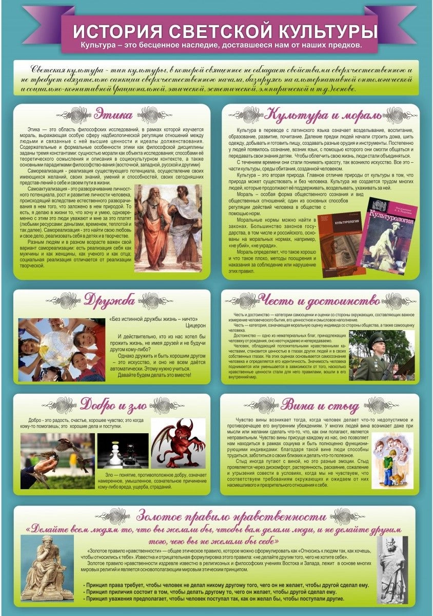 Интересный стенд с наличием ярких картинок и небольших текстов по теме. Всего на стенде семь «ячеек», заполненных сжатой, но ясной информацией. Здесь освещены не только лишь вопросы этики, дружбы и культуры с моралью. Так же ребята смогут прочесть необходимую информацию о добре и зле, достоинстве и чести. Важные чувства вина и стыда, которые зачастую исчезают из сознания современных школьников, так же выделены на этом стенде. В общем-то, золотое правило нравственности, так же выделено курсивом, как и понятия, названные выше. В принципе, подобный стенд необходим во всех кабинетах истории отечественных школ, но об этом часто забывают сами учителя либо дирекция школы.