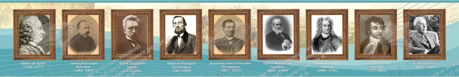 Стенд, на котором все очень четко. Даны девять изображений легендарных ученых историков, вложивших свой огромный вклад в развитие науки, в которую они верили. В рост той науки, которой они посветили, всю свою сознательную жизнь! Говоря о годах этой самой жизни, они указаны под портретами. И на этом стенде нет никакой подробной информации. Этим он и привлекает особенное внимание. А так же тем, что все портреты даны в горизонтальном порядке. И стенд напоминает своеобразную ленту. Безусловно, это ни фотографическая пленка, но уникальный дизайн, может вызвать подобную ассоциацию. Подойдет для того, чтобы ученики, заинтересовавшись привлекательным видом стенда, выучили имена великих людей и время, в которое те личности жили.