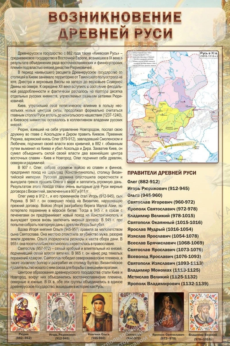 Стенд с портретами первых правителей, которые властвовали над всей Русью. Здесь и княгиня Ольга, и Святослав, и иные князья. Помимо этого, дана история возникновения Древней Руси, в очень лаконичном и интересном изложении. Прилагается карта и список правителей Древней Руси. С таким дизайном, в информации стенда не потеряться. Удобное расположение портретов, текста, карты и списка правителей под ней, не даст запутаться ни одному школьнику, даже на мгновение. Если уж и приобретать стенды для кабинета истории, то именно такие. Хоть карманов здесь и нет, но изложение, настолько увлекательное и подробное, что о кармашках не вспомнят даже преподаватели, которые ищут стенд с их наличием.