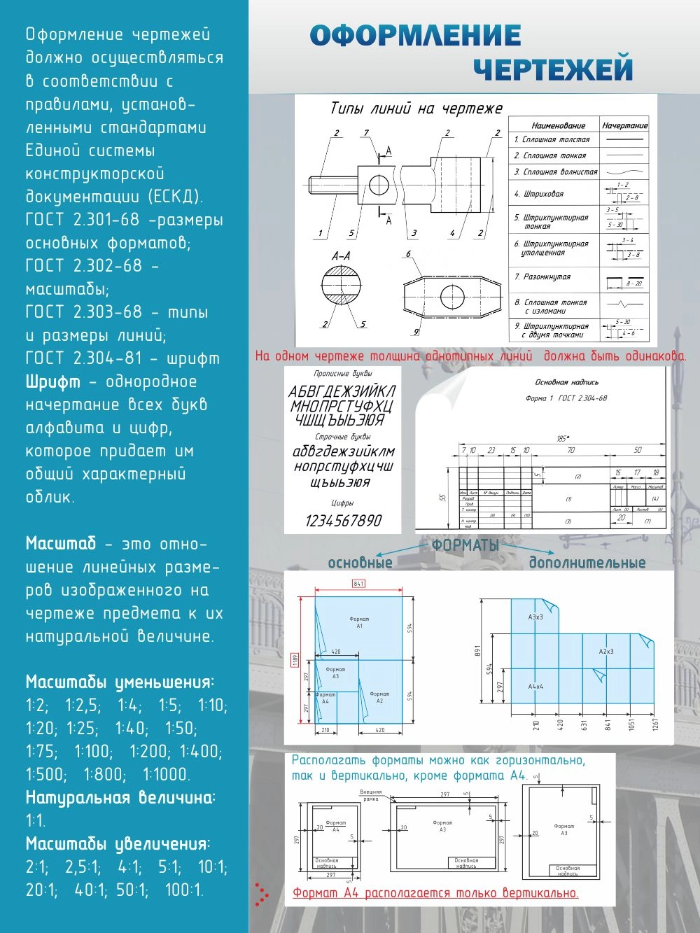 Чтобы у учеников не возникало лишних вопросов по поводу оформления чертежей, этот стенд все подробно рассказывает об этом. На нем указанны все нюансы и мелкие детали, которые просто необходимы для оформления чертежей. Ярко-синяя надпись "оформление чертежей" не останется незамеченной. Качество стенда на очень высоком уровне. ПВХ- пластик, пленка с фотопечатью, и ламинирующая пленка сделают стенд долговечным, сохранив его первоначальное состояние на долгое время. Краска не поблекнет и не потускнеет. А приятный фон будет радовать глаз долгое время. Такой стенд впишется в интерьер любого класса.