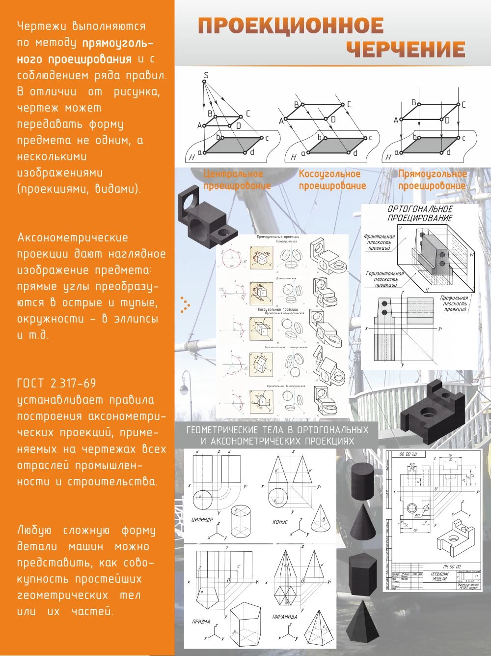 Такой стенд отлично подойдет не только для школы, но и для институтов с техническим уклоном. На нем школьники и студенты смогут найти информацию о проекционном черчении, изложенную в удобных таблицах с рисунками и чертежами. Стенд строг и аккуратен, без излишеств и отвлекающих деталей. Качество данного стенда на очень высоком уровне. ПВХ- пластик, пленка с фотопечатью, и ламинирующая пленка продлит срок службы стенда, сохранив его первоначальное состояние на долгое время. Краска не поблекнет и не потускнеет. А приятный фон будет радовать глаз учителю и ученикам. Он идеально впишется в любой класс.