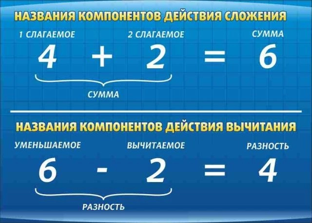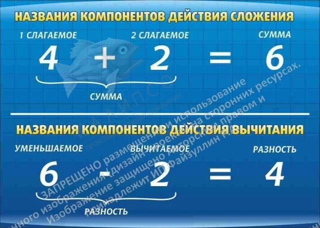 Такие действия, как вычитание и сложение – основа основ математической науки. Так что пренебрегать ими, не стоит, в любом случае. Отличная таблица на простом примере, излюбленном у многих преподавателей математики, показывает школьникам, что же такое «сложение» и «вычитание». Мало кто из учеников, может не понять подобного легкого объяснения. Великолепный дизайн стенда без различных излишеств, так же относится к плюсам предлагаемой таблички. Синий, белый и желтый оттенки, использованы в процессе создания этого стенда. Такие цвета приятны для глаз. Соответственно и со зрением проблем, ни у кого не появится.