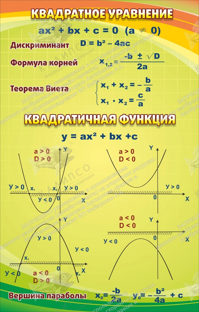 А вот и тема, которая многим школьникам, кажется не очень легкой. По крайней мере, поначалу. Иногда, даже совершенно не понятной. Но все зависит оттого, как объяснить новое и неизведанное, своим ученикам. Этот стенд станет верным помощником для каждого преподавателя. Интересный дизайн и отличное объяснение не самой легкой, в глазах школьников, темы – производят самое благоприятное впечатление. Поскольку на стенд, хочется смотреть снова и снова, не избежать никому не только запоминания, но и понимания, представленной здесь информации. В ином случае, ветви параболы и прочие чудеса, покажутся ученикам, намного сложнее, как подсказывает практика.