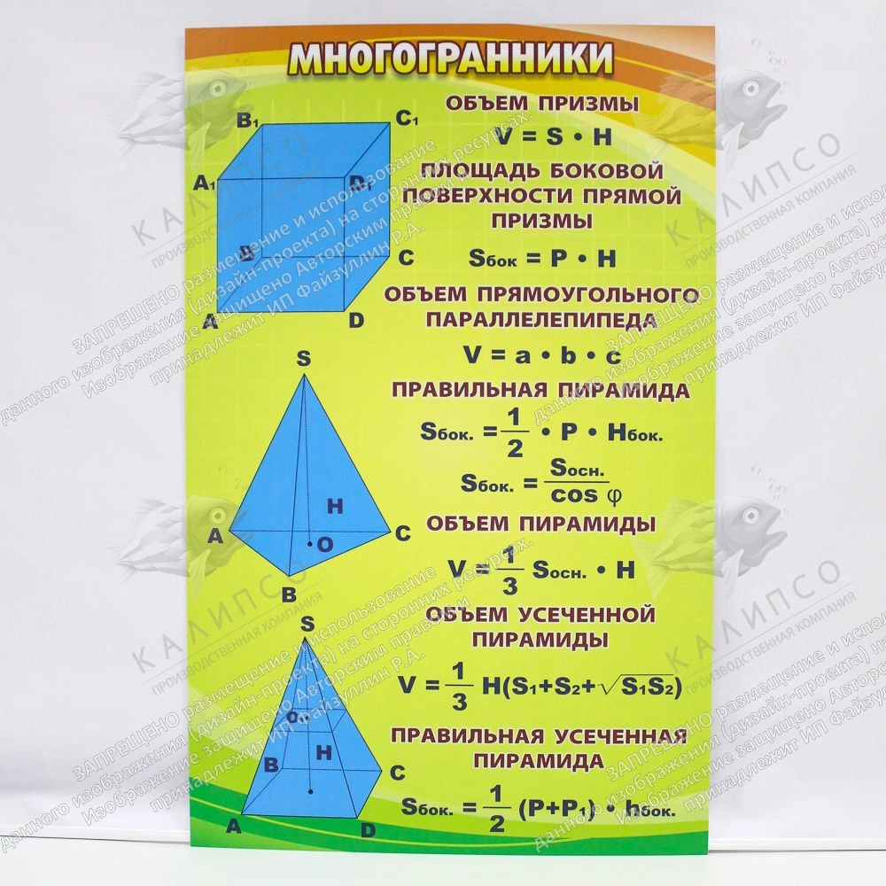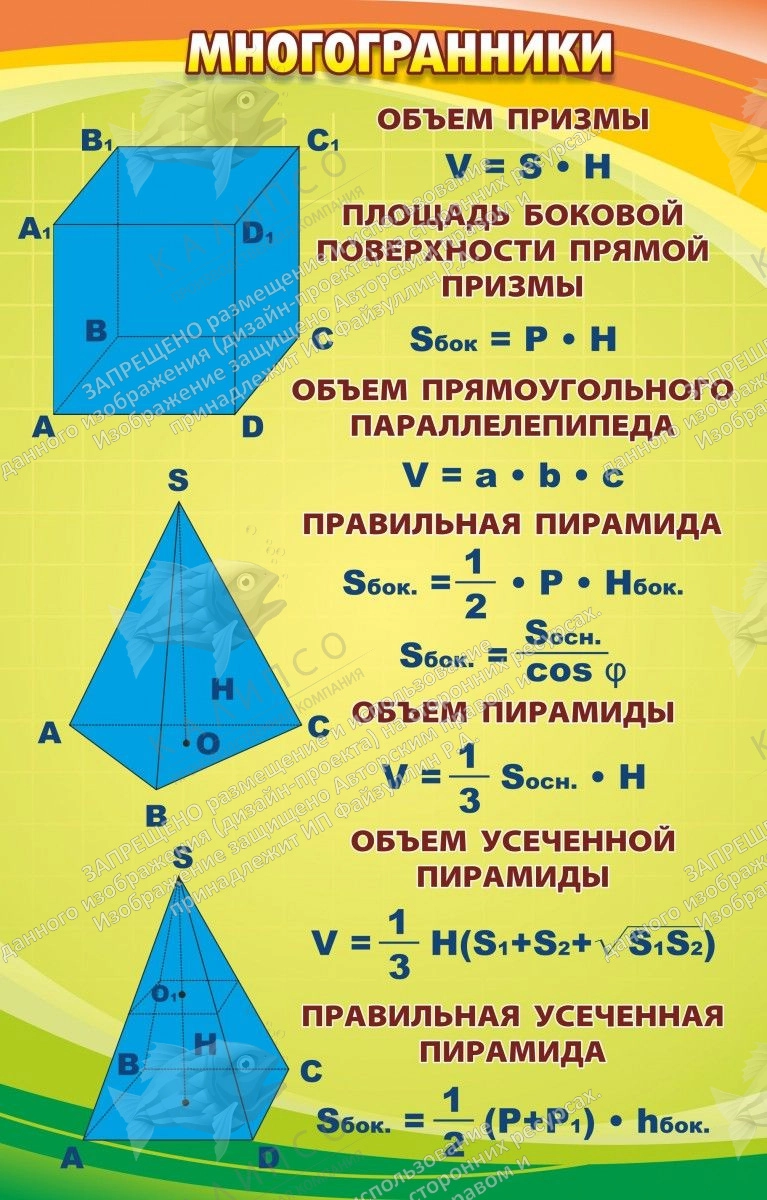 Тема, которая будет задействована, в какой-то степени, не только лишь на математике, но и на черчении. Стенд с многогранниками выполнен в безупречном сочетании яркого дизайна с четкой подачей необходимой темы. Сплошные формулы и красивые фигуры. Многим школьникам тема эта нравится больше всех остальных, хотя формулы сами, надо сказать, не совсем легкие. Но этот стенд позволит сделать реальностью мечту многих учителей, связанную с тем, чтобы максимально легко и доходчиво, объяснить сложную суть многогранников, их ученикам. Скорее всего, именно на таких уроках, многие школьники начинают мечтать о преподавательской деятельности, в будущем!