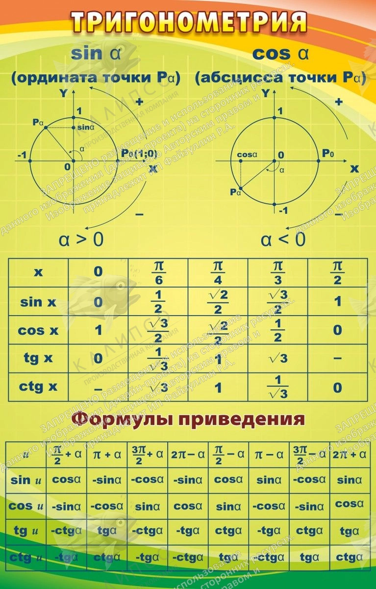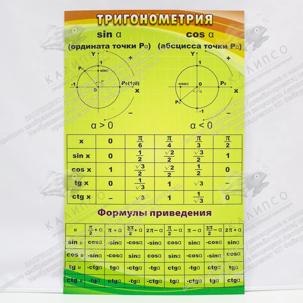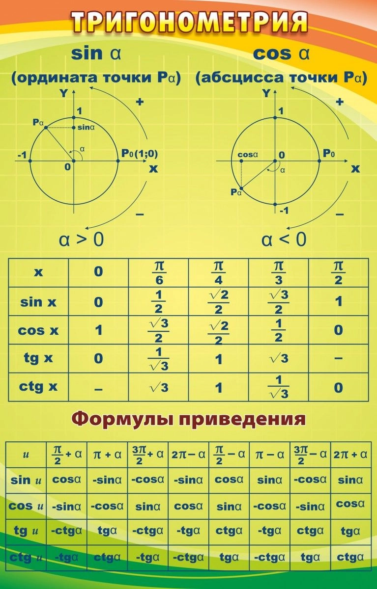 Сложная тема тригонометрии, запомнится намного легче и быстрее, если в классе будет такой стенд. А, самое главное, ученики поймут данную тему, максимально скоро. Тангенсы и котангенсы, а также и косинусы с синусами, будут покорены, намного быстрее, при наличии в кабинете этого стенда. Сложные параболы и формулы приведения в доступной к пониманию школьников таблице, красуются на стенде, который ярким фоном, будет поднимать настроение, всему классу. Зря многие современные учителя и администрации средних учебных заведений, не понимают, что и от дизайна учебных стендов, зависит успех изучения школьниками, тех или иных тем.