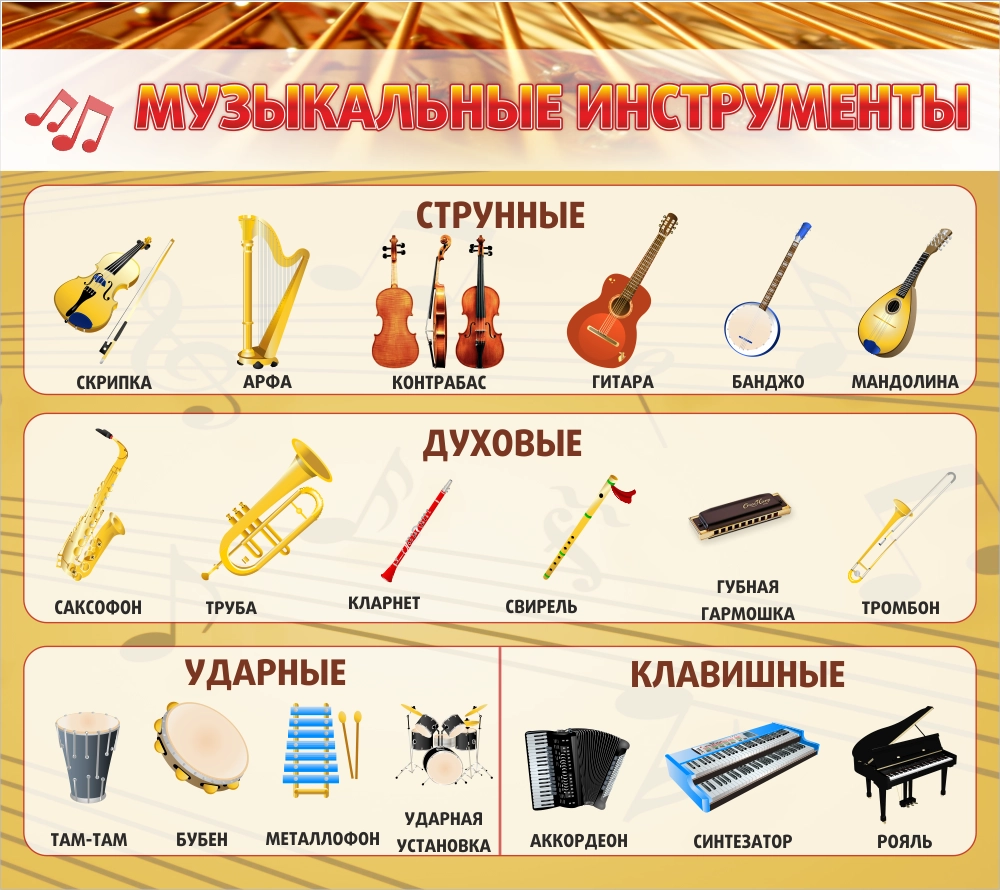 Настало время выучить название музыкальных инструментов! Прекрасный стенд с понятными рисунками, который идеально подойдет для школьного музыкального кабинета. Здесь и струнные инструменты, и духовые, и ударные, и клавишные. К каждому из инструментов есть картинка. В общем-то, ни один ученик не заскучает, рассматривая этот яркий и интересный стенд. Ведь это намного увлекательнее, чем учить геометрические формулы. А объяснения с картинками, всегда нравились детям во все века и времена. Отличный и современный стенд, который станет украшением музыкальной по тематике, скучных серых стен.