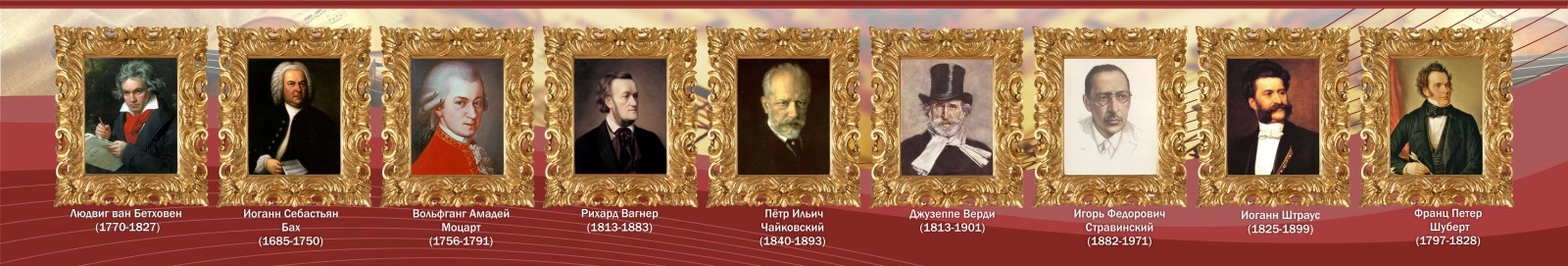 Такой стенд побудит учеников, серьезнее относиться к музыке, к великим композиторам и музыкантам. Золоченые рамки, роскошный дизайн прикуют взгляд к портретам, благодаря чему ученики запомнят годы жизни и имена величайших композиторов и музыкантов.