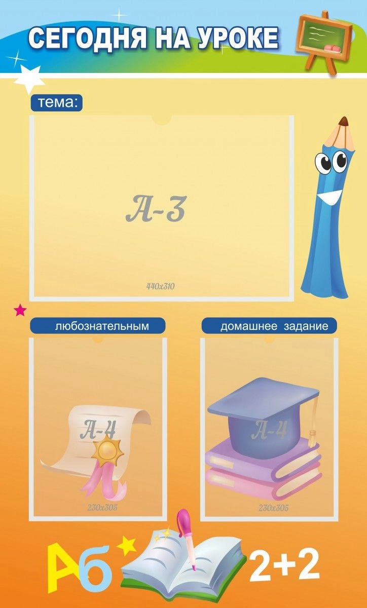 Этот яркий стенд включает один кармашек А3 и два кармана А4. Невероятно привлекательный дизайн, будет радовать весь класс, и побуждать к хорошей учебе всех школьников. Одно окно с карманом под названием «Тема», а два других кармана называются «Любознательным» и «Домашнее задание». Забавный дизайн стенда полон самыми яркими красками. Но учиться, это вряд ли помешает, хотя бы одному школьнику младших классов. Собственно, стены кабинетов подобных маленьких учеников, обычно и украшены самыми яркими и необычными стендами. Так что этот вариант отлично подойдет. Следует вкладывать в кармашки любую необходимую информацию.