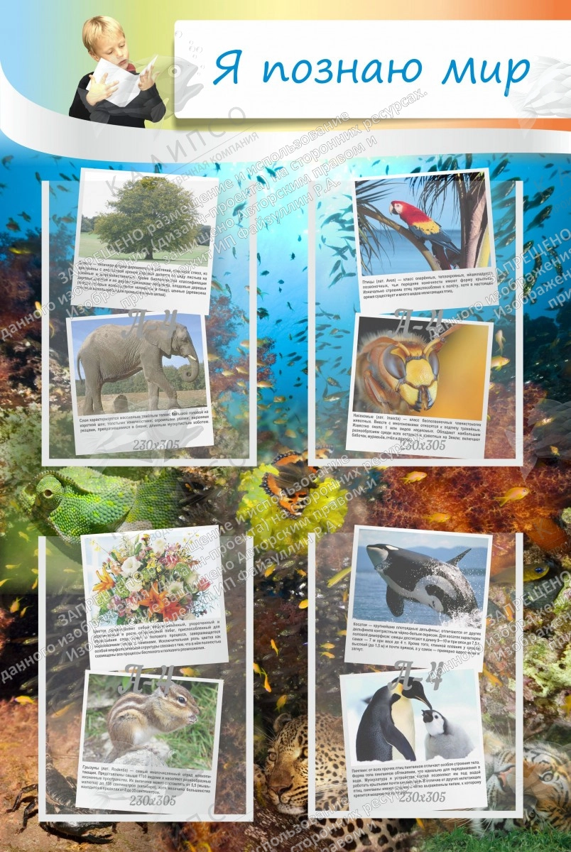 Отличный, очень яркий и красивый стенд! Он способен достойно украсить стену в кабинете любого начального класса. Здесь подводный мир и надводный. В общем-то, все очень живописно и в идеальном сочетании. Помимо этого, имеется в наличии четыре кармашка А4. И, естественно все эти карманы, грех не заполнить, самой интересной информацией об окружающем мире. Школьники таким образом познают Вселенную, а учителя могут сделать свой класс самым «познавательным» и красивым. Дизайн стенда сразу бросается в глаза, да и информация здесь дана о слонах, попугаях и иной живности. Этот стенд прекрасно впишется в обстановку кабинета для учебы малышей.
