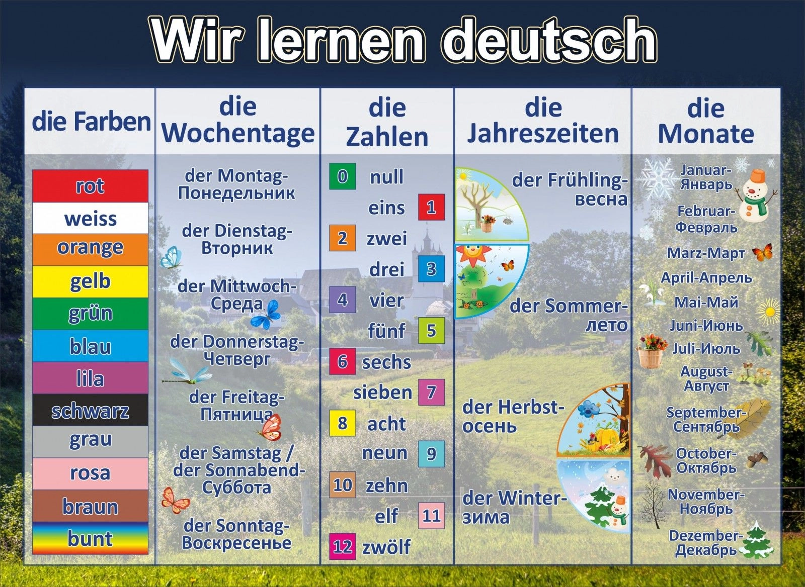 Яркий и вместительный стенд. Карманов на нем нет, но информации, которую смогли уместить на этом стенде, и так предостаточно. Здесь и времена года, и название самых разнообразных красивых оттенков, и дни недели. В общем, сведений масса. И для начинающих это прекрасное подспорье, а для тех, кто подзабыл какие-то слова или выражения, это отличный источник, чтобы получить нужную информацию. Так же на стенде имеется информация, по поводу звучания различных цифр на немецком языке. Собственно, невероятная красочность стенда, послужит дополнительной «зацепкой» для интереса детей. Веселые рисунки так же понравятся ребятам.