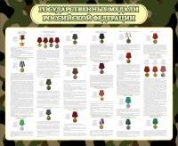 На стенде «Государственные медали РФ» предоставлены разнообразные медали и информация за какие заслуги ими награждают, каждая медаль имеет свою историю происхождения и названия. Здесь наглядно демонстрируются все популярные медали, которые позволяют ученикам и курсантам ознакомится с историей великих государственных наград, также узнать материалы и использованные металлы для их производств. Стенд изготовлен из высококачественного прочного пластика, придающий большую легкость. На основании есть картинка с медалями в высоком разрешении, покрытая защитной пленкой.