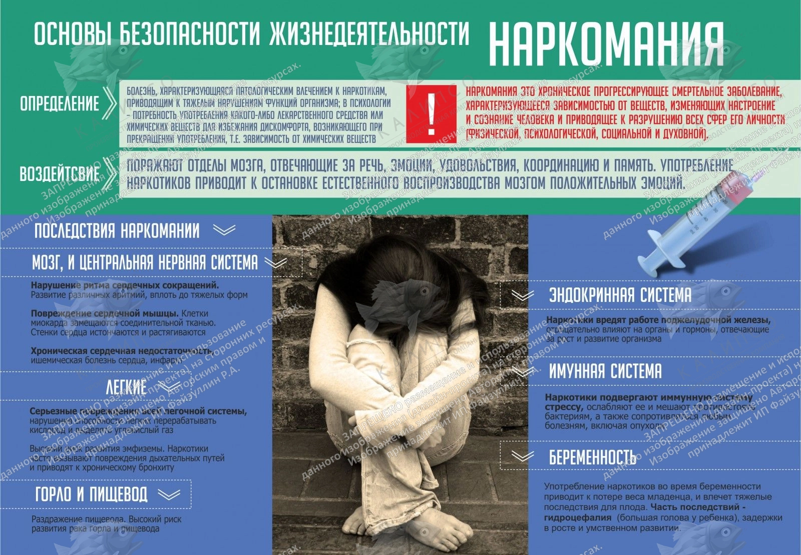 С маленького возраста всем детям следует знать, что значит наркомания и какие необратимые последствия она может нести. Поэтому был изготовлен современный информационный стенд «Наркомания», подробно описывающий воздействие наркотиков на головной мозг и общее состояние человека. Информация, которая находится на стенде, предоставлена простым текстом, понятным как для старших, так и для более маленьких учеников образовательных учреждений. Преимуществом стенда, сделанного из ПВХ, является возможность самостоятельного монтажа на любую разновидность стены без привлечения специалистов.