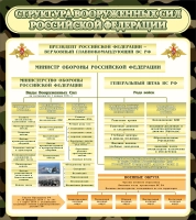 На информационном стенде «Структура вооруженных сил РФ» предоставлена подробная древовидная схема всех командующих вооруженными силами РФ по их подчинению. Стенд позволяет ученикам и курсантам военных училищ ознакомится со всеми должностными лицами по степени их значимости и подчинению в рядах вооруженных сил РФ. Основание информационного поля изготавливается из противопожарного и экологически чистого ПВХ с хорошей защитной ламинацией, что позволяет его эксплуатировать в совершенно любых помещениях. Крепить такой стенд можно на скотч или другим подходящим способом.