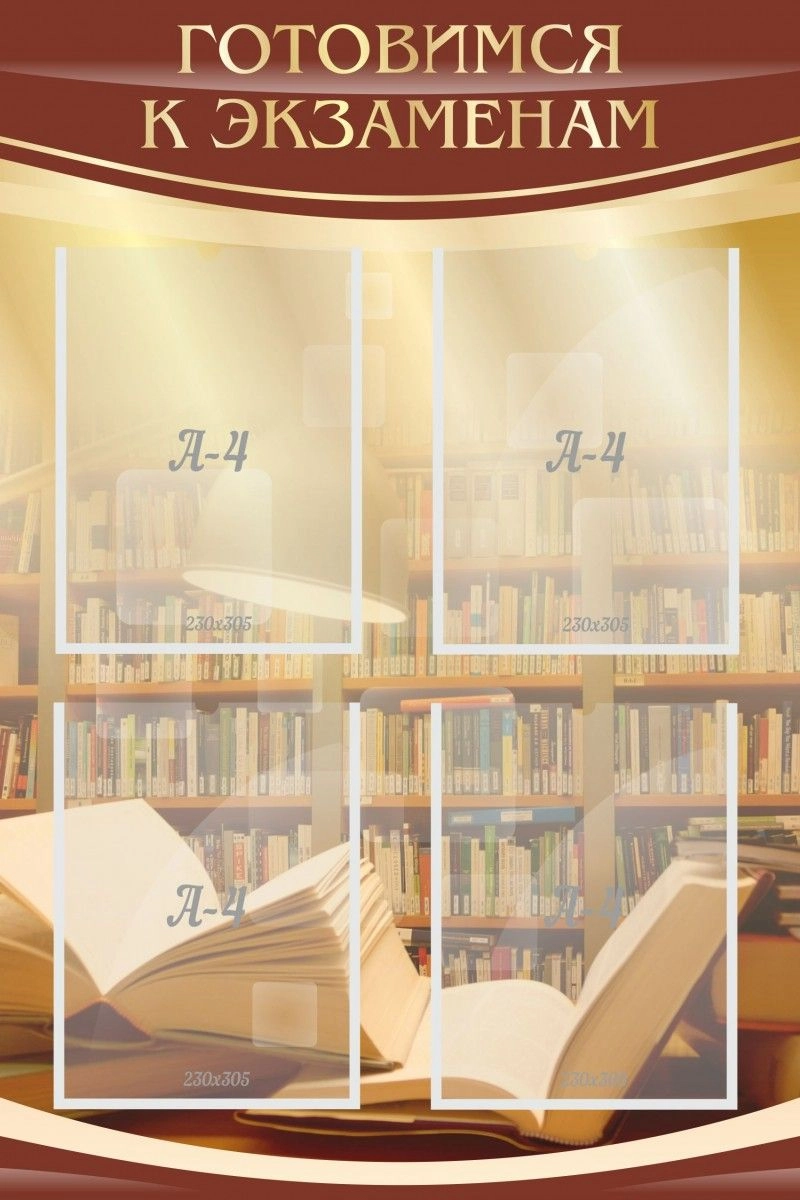 Экзамен - это психологически трудный и важный этап в жизни каждого ребенка, особенно когда недостаточно информации для подготовки прохождения экзаменов. Школьник начинает тратить время на поиски необходимого материала вместо того, чтобы изучать. Стенд «Готовимся к экзаменам» поможет избавить ученика от лишних поисков с помощью четырех карманов, предназначенных для смены информации о предстоящих экзаменах. Руководство школы может также расположить в данных карманах статьи о дополнительной литературе, информацию о подготовительных курсах и прочие интересные источники для помощи в экзаменах.
