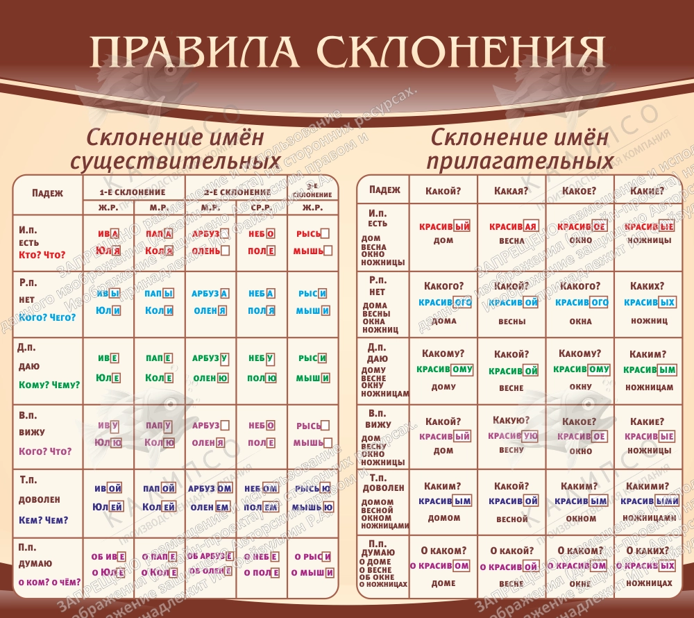Каждому ученику образовательных заведений в своей жизни предстоит изучать множество правил по предмету русского языка, и не исключением являются правила склонения, которые очень важно не только знать, но и понимать, как для хороших отметок, так и для будущей жизни. Современные учителя специально для учеников, для облегчения и лучшего понимания этой темы в своих кабинетах стали размещать стенд «Правила склонения», на котором написаны правила склонения имен существительных и прилагательных, падежи, вопросы к ним и прочая информация, которая аккуратно занесена в две таблицы. Стенд сделан из легкого современного пластика, который не доставляет неудобств во время перевозки и монтажа.