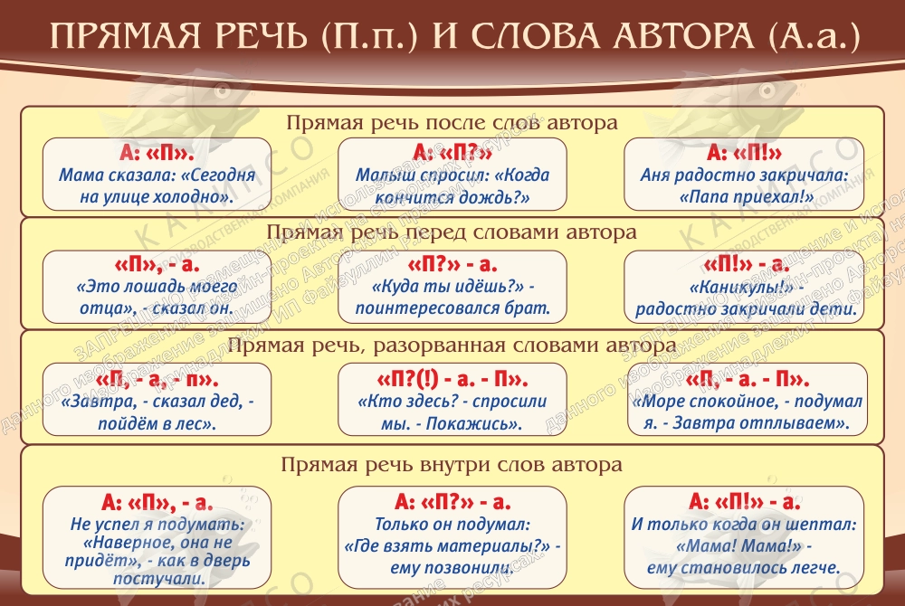 В русском языке существуют исключительные правила и, чтобы все эти правила остались незабытыми у ученика, недостаточно повторять их на уроке, они так же должны и присутствовать в кабинете русского языка в виде подсказки. Для помощи ученику и учителю был разработан информационный стенд с названием «Прямая речь и слова автора» с информацией, написанной в доступной форме и хорошо понятной ученику, где ясно показано где и как ставится прямая речь и слова автора, а приведенные примеры помогут в случае какого-то недопонимания материала. Дизайн сделан таким образом, чтобы основные элементы выделялись и хорошо воспринимались.
