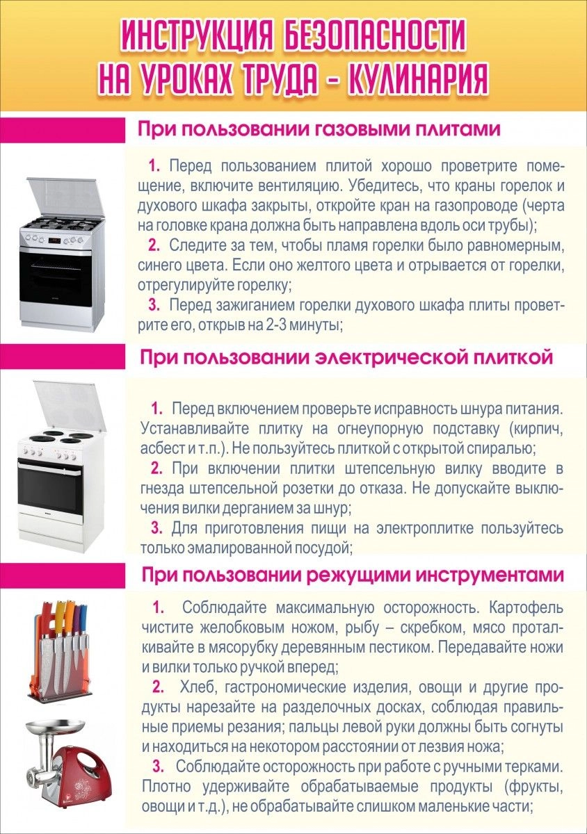 В жизни всех девочек наступает такой момент, когда она становится взрослой и заниматься женскими делами, такими как готовка еды, становится необходимым для ее семьи и детей. Стенд «Инструкция безопасности на уроках труда» предназначен именно для того, чтобы школьницы были осведомлены всеми мерами предосторожности, которые связанны с пользованием газовой и электрической плиток, что очень важно знать всем ученицам для предотвращения каких-либо травм. Хорошо изучив такой стенд, каждая девочка может смело находиться на кухне и пользоваться кухонными плитами во время приготовления пищи.