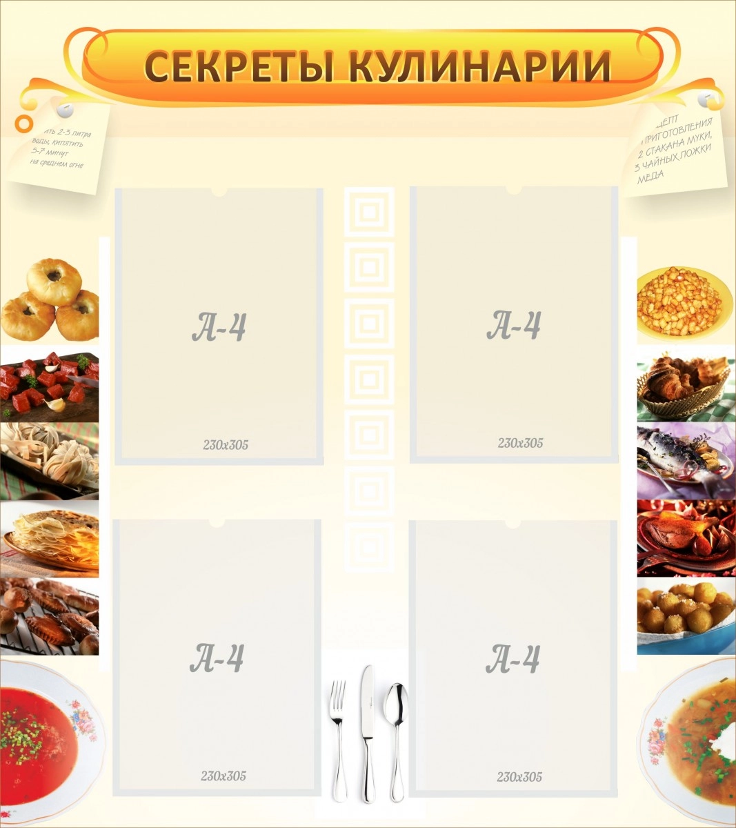 Каждая девочка — это в будущем хозяйка, и поэтому ученицам образовательных учреждений полезно интересоваться кулинарией уже с самого детства. Стенд «Секреты кулинарии» выполнен именно для того, чтобы юные школьницы знали все секреты кулинарии и могли легко чувствовать себя за плитой, что обязательно пригодится в будущей жизни каждой девочки. Стенд удобен тем, что в нем может постоянно находится разная информация о приготовлении блюд, так как карманы специально сделаны для смены материала и других объявлений. А глядя на «вкусные» картинки, расположенные по бокам, возникает непреодолимое желание что-нибудь приготовить.