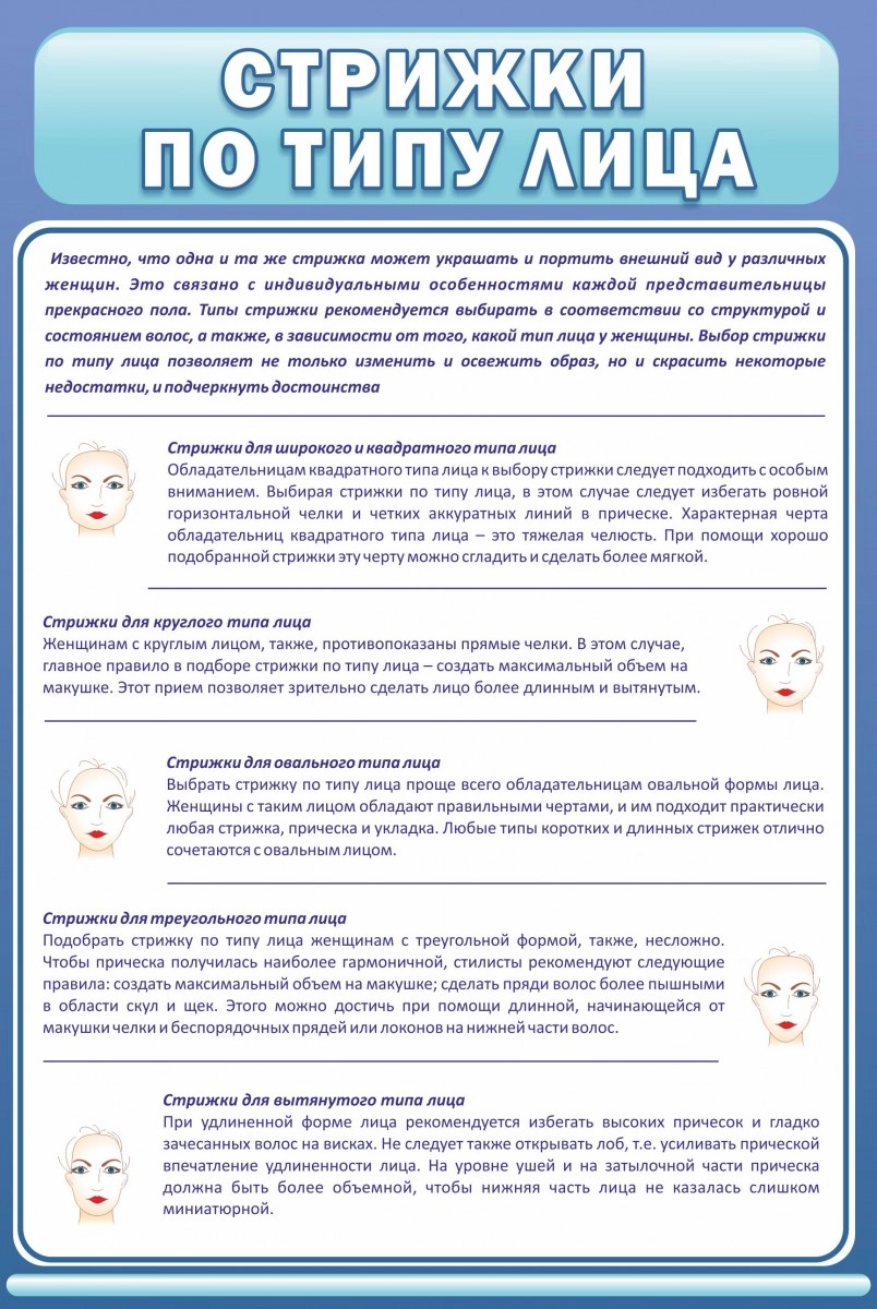 Некоторые девочки, не смотря на свой небольшой возраст, начинают всерьез интересоваться стрижками, - смотрят как они делаются, что для этого надо, и в будущем многие из них, действительно, посвящают себя этой профессии. Стенд «Стрижки по типу лица» позволяет понять ученицам какие прически для каких форм лица подходят, что очень важно знать специалисту для правильного подбора стрижки. Информация на стенде написана легким, простым языком, которая после уже первого прочтения легко и быстро запоминается, а сопровождающие ее иллюстрации дают четкое представление о данном материале.