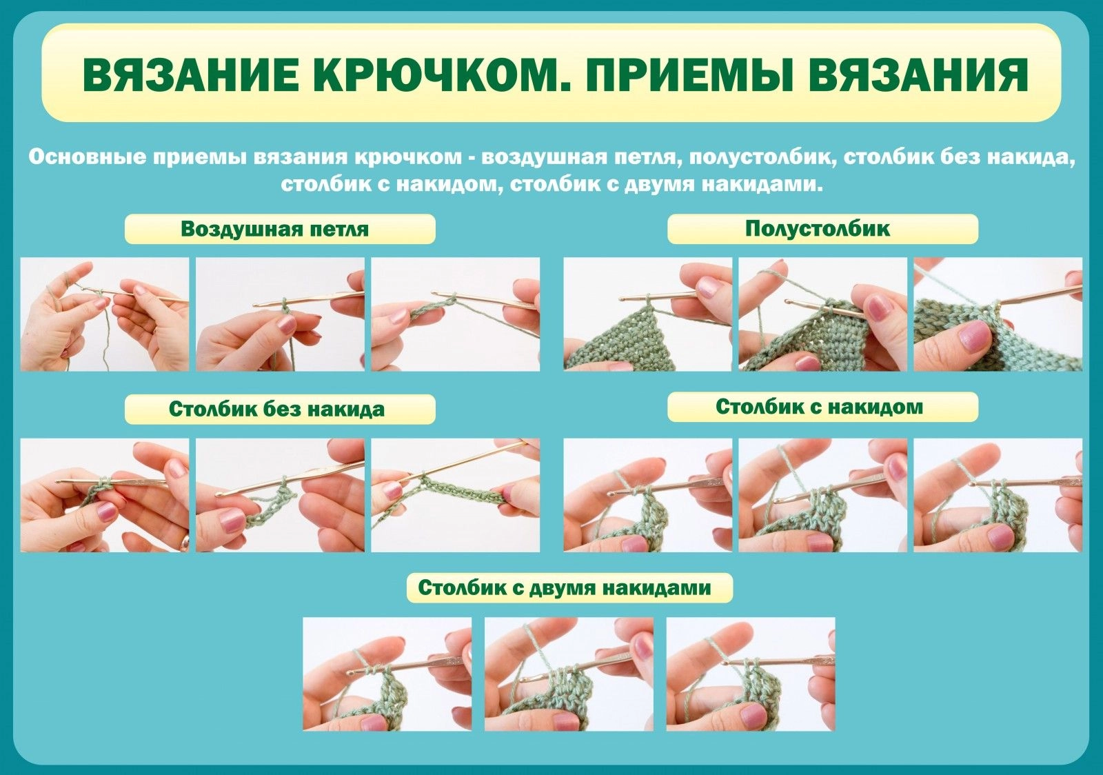 Большинство девочек с очень раннего возраста начинают проявлять интерес к вязанию, что несомненно понадобится в их будущей жизни. Настенный стенд «Вязание крючком. Приемы вязания» сделан в виде небольшой и удобной инструкции, где показаны все основные приемы вязания, позволяющие ученицам образовательных заведений понять и самим узнать и опробовать какие-то первичные навыки по вязанию крючком. Стенд нежного голубого цвета, отлично оформленный, имеет подробные картинки, показывающие как делаются различные петли при вязании крючком, что важно знать только начинающим.