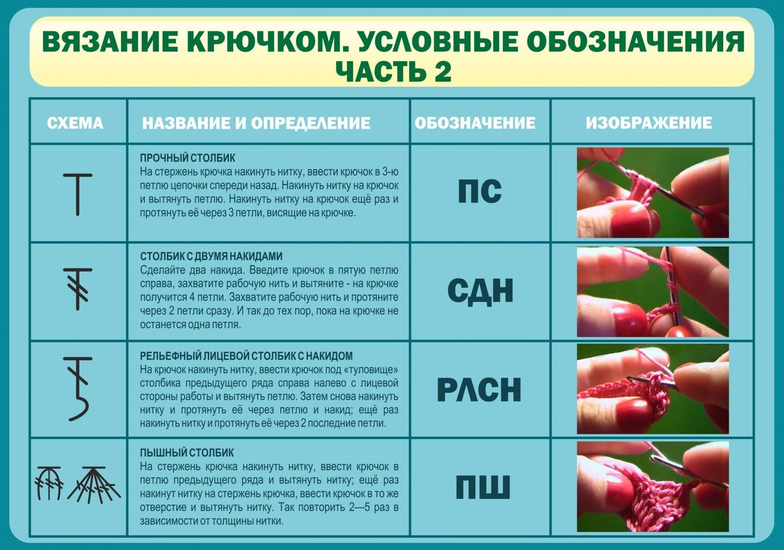 Очень часто девочки еще в раннем возрасте начинают проявлять большой интерес к вязанию, что обязательно пригодится им в будущем. Стенд «Вязание крючком. Условные обозначения. Часть 2» - продолжение стенда «Вязание крючком. Условные обозначения. Часть 1» подробно описывает все названия, определения и обозначения петель, которые необходимо делать во время вязания крючком. Справа находятся небольшие красочные иллюстрации, которые помогают хорошо понять, как делаются различного вида петли, а яркий голубой фон привлекает внимание юных учениц, стремящихся обучиться вязанию крючком.