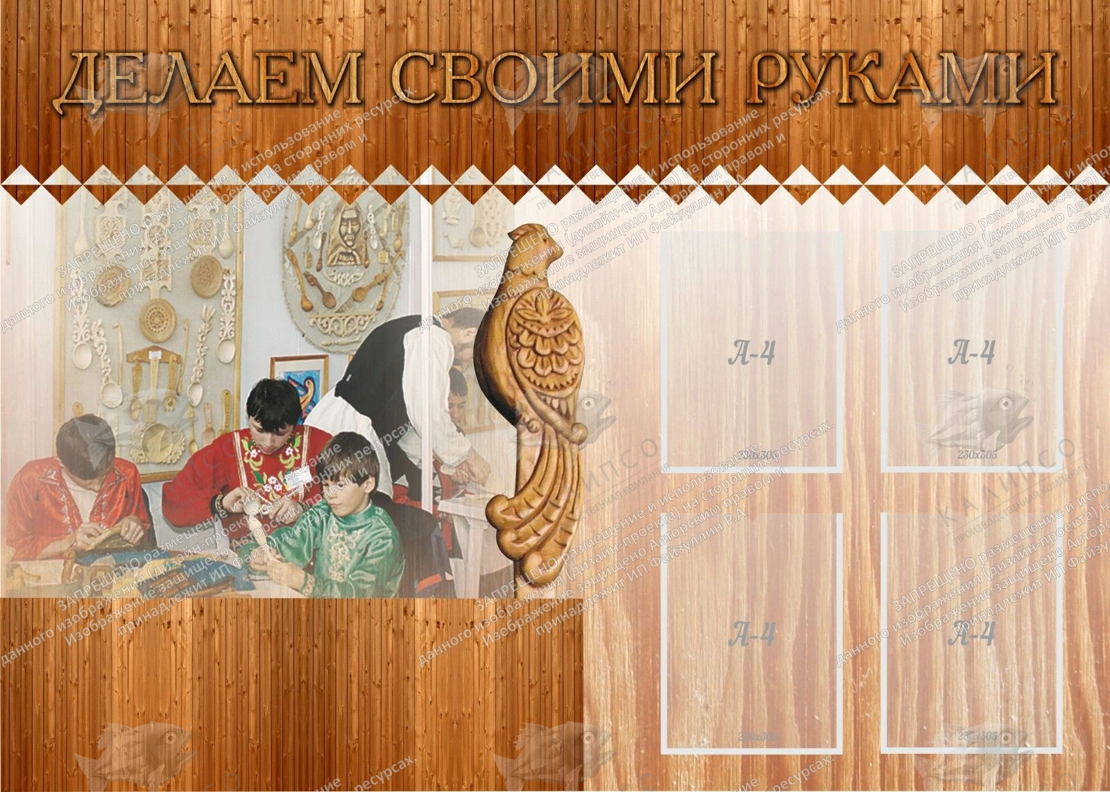 Каждому мальчику необходимо уметь делать что-то своими руками, что, несомненно, может пригодиться в будущей его жизни. Стенд «Делаем своими руками» изготовлен специально для учеников образовательных учреждений, на котором располагаются четыре стандартных кармана формата А4, позволяющие без труда менять информационный материал, полезный юным школьникам. Стенд оформлен ярко в виде деревянной отделки, который не позволит пройти мимо, а фотография, на которой изображены мальчики, изготавливающие что-то своими руками, дает мотивацию школьникам творить своими руками.
