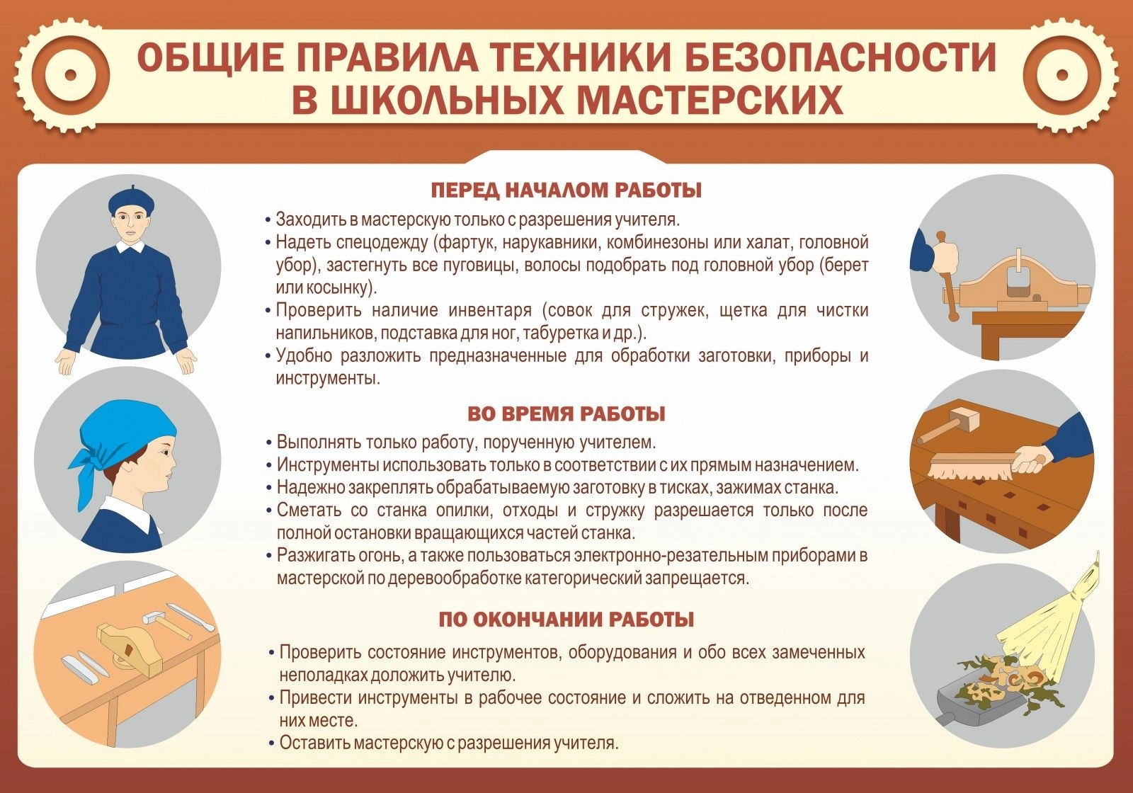 Каждый маленький мальчик по своей натуре был и остается проказником, и обязанность школы как можно больше предостеречь его от совершения каких- либо ошибок, которые могут повлечь за собой вполне серьезную травму. Стенд «Общие правила ТБ в школьных мастерских» обязательно должен располагаться в кабинетах учебных заведений, так как он помогает учащимся обезопасить себя во время работы в школьной мастерской на уроках труда. Данный стенд предоставляет общие правила нахождения в мастерской и популярно объясняет, как нужно вести себя во время мужских работ, чтобы выйти оттуда целым и невредимым.
