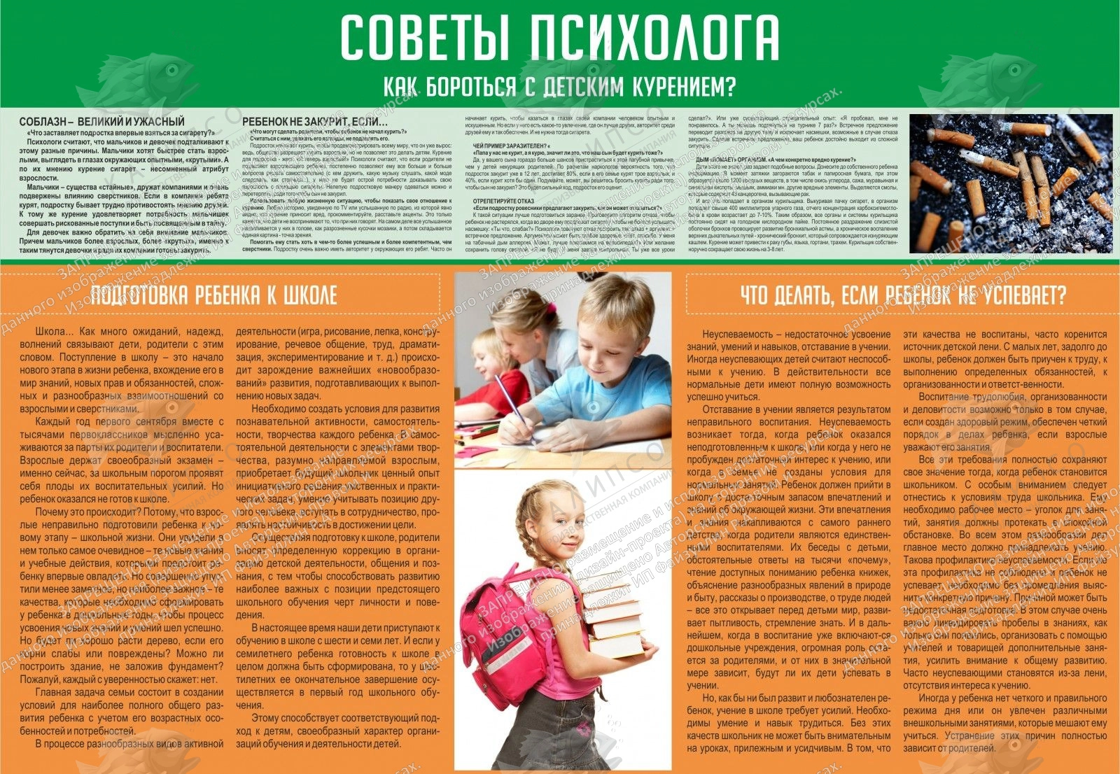 Очень полезный стенд «советы психолога» поможет в трудностях с ребенком, как родителям, так и учителям. Такой стенд необходимо повесить в холле или даже в каждом коридоре школы. На стенде размещена информация о вреде курения, чтобы школьники понимали, как это вредно и описано для здоровья и жизни. Так же учителя и родители могут прочитать информацию о том, что делать, если ребенок отстает по школьной программе. Одним из полезных разделов на стенде можно считать статью «подготовка ребенка к школе». Такие полезные советы от ведущих специалистов помогут наладить контакт с ребенком и объяснить ему, что и почему для него лучше.