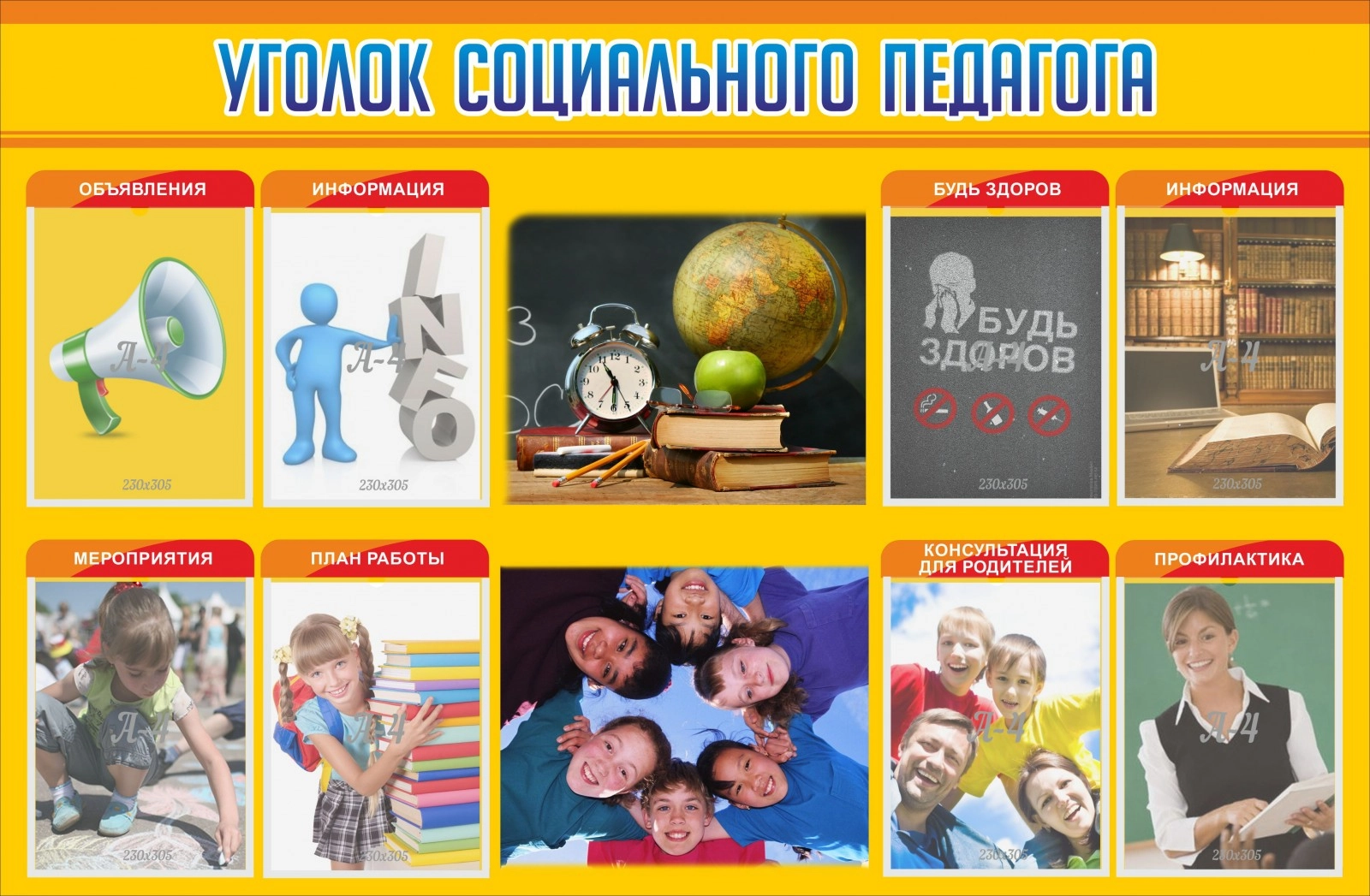Красочный желтый стенд «уголок социального педагога» сделан специально для того, чтобы объединить все необходимую информацию не только об учебном процессе, но и о консультациях для родителей, объявлениях, плане работы и другого рода мероприятиях. Каждый раздел секции имеет свою надпись и качественное печатное фото по теме для разной информации. Яркая цветовая гамма наверняка привлечет внимание сотрудников школы и учеников к важной информации, а 8 вертикальных карманов для листов А4 позволят разместить необходимые документы или объявления под прозрачную ламинирующую пленку.