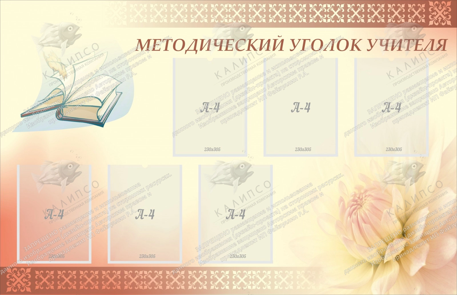 Уникальная модель стенда «методический уголок учителя» выполнена в пастельных тонах, а наличие рисунка в виде большой белой астры и развернутой книги придает стенду школьную атмосферу знаний. Производитель позаботился не только об оригинальном внешнем виде, но и о качестве. Данная модель стенда изготавливается из пластика ПВХ, что делает весь лист очень легким. Такой стенд можно без усилий установить самостоятельно, используя обычный двухсторонний скотч. Методический уголок учителя можно заполнить любой информацией на листе А4, для этого стенд имеет шесть прозрачных карманов.