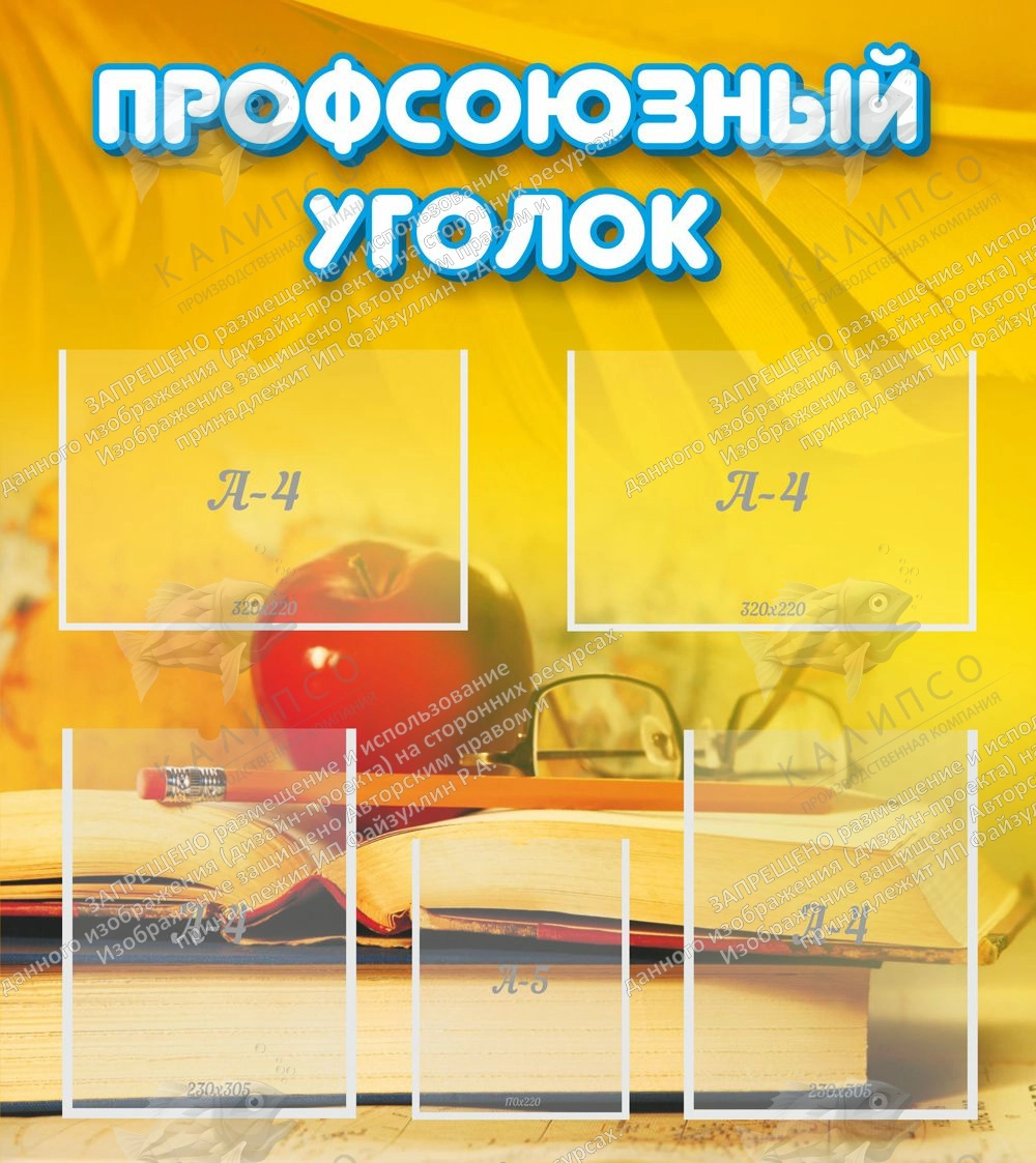 Красивый желтый цвет стенда, сделанного из пластика ПВХ, не только добавит уюта в учительский кабинет, но и позволит разместить необходимую информацию. Для этого стенд имеет 4 кармана для листов формата А4, и один для формата А5. Стенд отличается своим легким весом, поэтому установить его очень просто. Ламинирующая пленка защитит стенд от деформации, а пленка с фотопечатью позволит надолго сохранить качество фонового рисунка всего стенда. Такой оригинальный дизайн стенда, а также наличие пяти секция для бумаг разных форматов хорошо впишется в любой интерьер, и придаст ему свежести и ярких красок.
