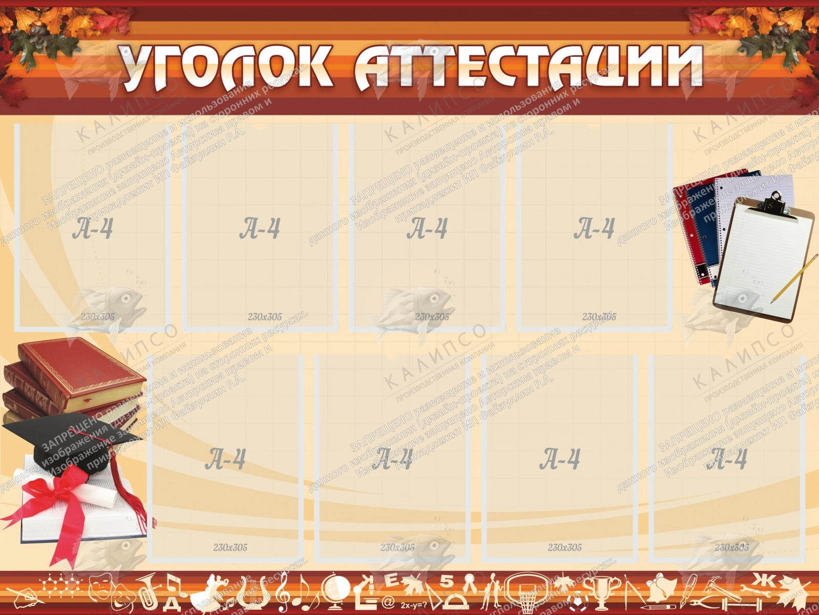 Что может быть важнее для учителя, как не период аттестации. Множество информации, расписаний, графиков, ведомостей – все это просто не возможно удержать в голове. Для этого теперь есть стенд «уголок аттестации». Его главным преимуществом можно считать большое количество секций для листов формата А4. Всю главную информацию можно разместить в восемь карманов, при необходимости можно легко заменить необходимые листы, благодаря наклонному дизайну каждой секции. Качественный материал и не яркий рисунок делают стенд «уголок аттестации» просто находкой для любой учительского кабинета.