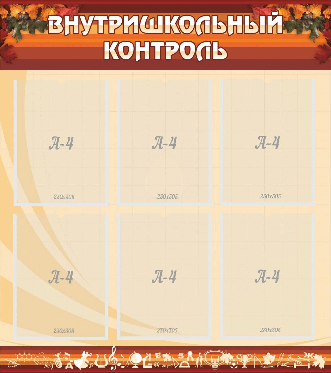 Оригинальная модель стенда для внутришкольного контроля выполнена в красивом бардовом цвете с добавлением полосок разных оттенков. Отсутствие ярких тонов и наличие цветочных рисунков по краям надписи отлично подойдут к общему интерьеру школьного коридора. Стенд сделан из качественного материала, который не только отличается своей прочностью, но и имеет небольшой вес. Такую модель стенда можно легко прикрепить на двухсторонний скотч или же на саморезы. Шесть отдельных секций для листов формата А4 имеют небольшой наклон, с помощью которого со вставкой и изъятием листов не возникнет проблем.