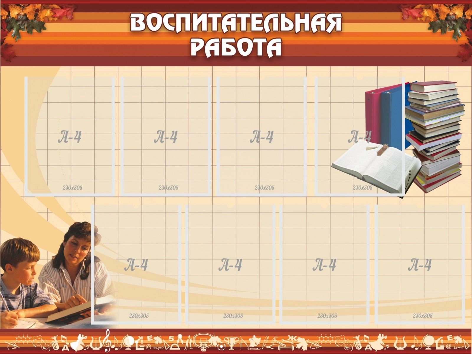 На стенде «воспитательная работа» имеется 8 карманов, в каждый из которых помещается вертикальный лист А4. Верх кармана имеет наклонный надрез, что позволит без труда заменить необходимый лист с информацией. Стенд сделан из пластикового листа ПВХ, а фоновое изображение было нанесено с помощью качественной фотопечати 720 dpi. На стенде «воспитательная работа» имеются красочные изображения, которые не стираются и не выцветают со временем. Такую необычную модель стенда можно повесить в холле школы, для ознакомления учащихся с учебно-воспитательным процессом. Для удобства восприятия информации фоновый цвет стенда выполнен в спокойных и теплых тонах.