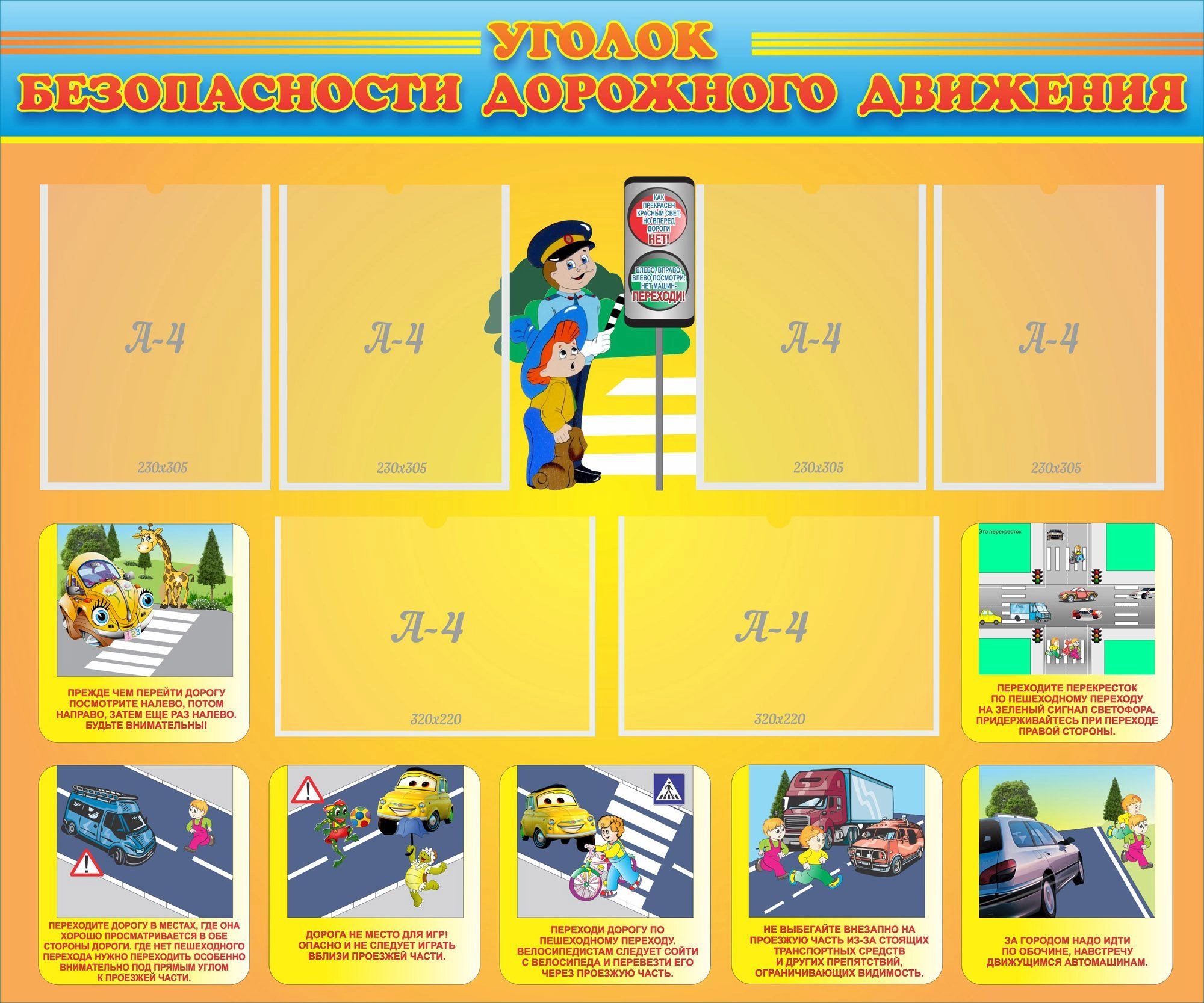 Каждый ребенок должен знать, как правильно переходить через дорогу. Жизненно необходимой эта информация будет жителям мегаполиса. Стенд имеет выгодный дизайн. В нем органично сочетаются карманы для размещения информации, расположенные в верхней части стенда, с наглядными картинками, которые присутствуют в нижней части стенда.
