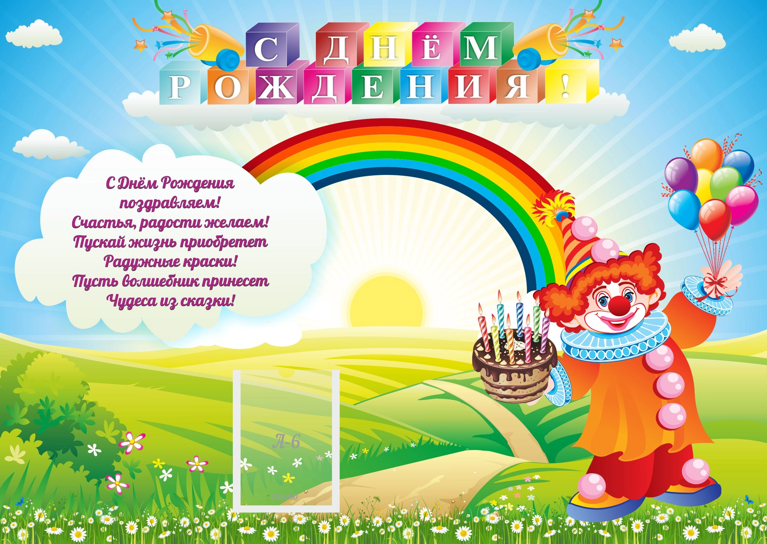 У малыша день рождения, но как же его поздравить? В этом поможет наш стенд «С днем рождения». Информационный карман предназначен для размещения яркой фотографии именинника. Главный элемент дизайна – веселый клоун, который спешить поздравить малыша. Он приготовил для ребенка красивый стих, а еще принес шоколадный торт и воздушные шарики. Стих написан на белом облаке, а в небе светит яркое солнце. Название стенда имеет необычный дизайн: оно выполнено разноцветными кубиками с буквами. Малыш будет рад услышать поздравления в свой адрес и увидеть свою фотографию на стенде. При изготовлении используются современные высококачественные материалы.