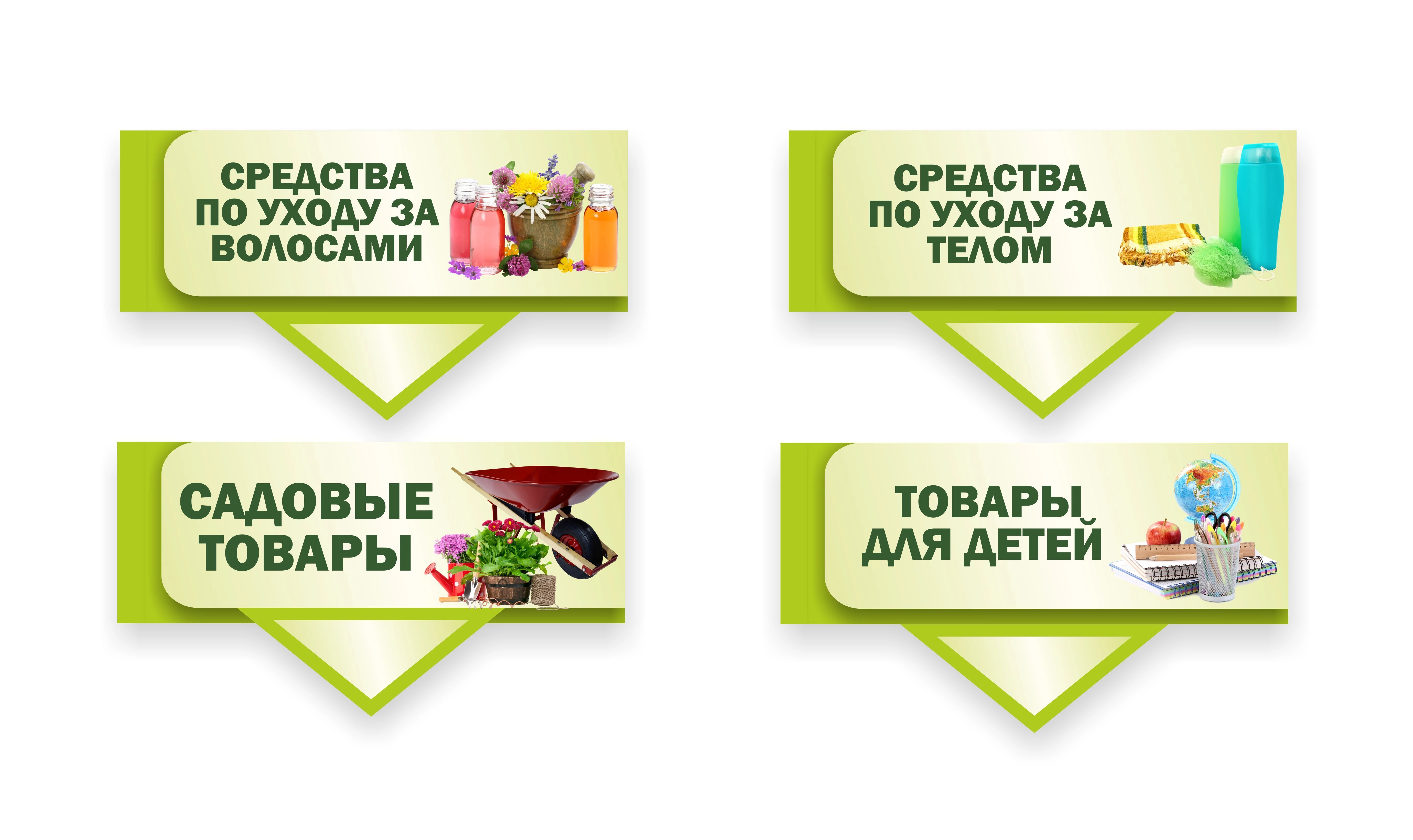Применение вывески с наименованием торгового отдела приходится больше всего на крупные торговые залы, гипермаркеты, в местах большого скопления товара на огромной площади. Однако, возможно применение навигации в качестве зонирования отделов, полок с товарами. Помимо нежного фона и ярко выделенной надписи в данной модели присутствует картинка, которая соответствует тексту. Например, в указателе «Товары для детей» изображены игрушки, краски, книжки. Так же табличка имеет указатель в виде стрелочки-треугольника, который направлен вниз. Изделие напечатано при помощи водонепроницаемой краски с защитной пленкой.