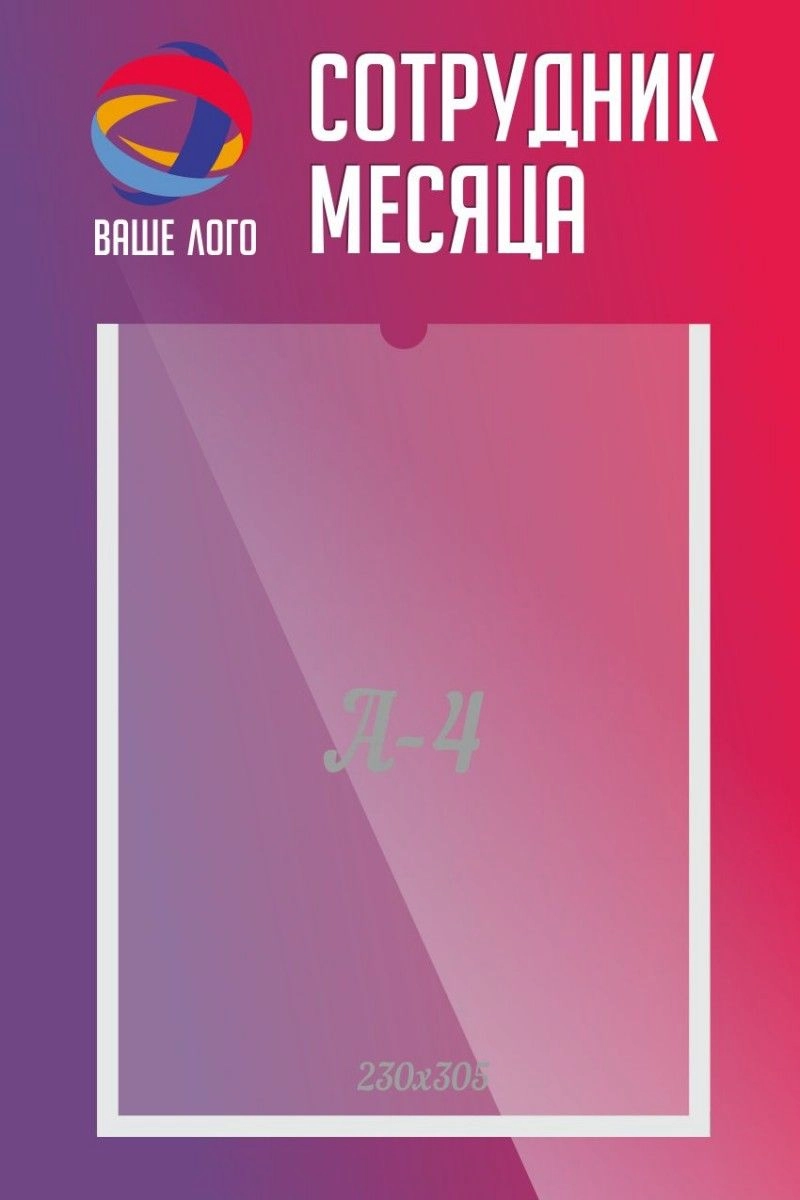 Многие предприятия для того чтобы повысить эффективность труда выбирают сотрудника месяца и вывешивают его фотографию на самом видном месте. Стенд небольшого размера и сделан специально на одну фотографию, кармашек сделан с прорезью по горизонтали. Его хорошо использовать в офисах с большой численностью сотрудников. Табличка имеет яркий цвет, эмблему и надпись «Сотрудник месяца». Пластик ПВХ придает табличке легкий вес, что облегчает установку. Кармашек изготовлен из прозрачного пластика. Установка изделия займет всего пять минут, т.к. для этого используется несколько саморезов или скотч.