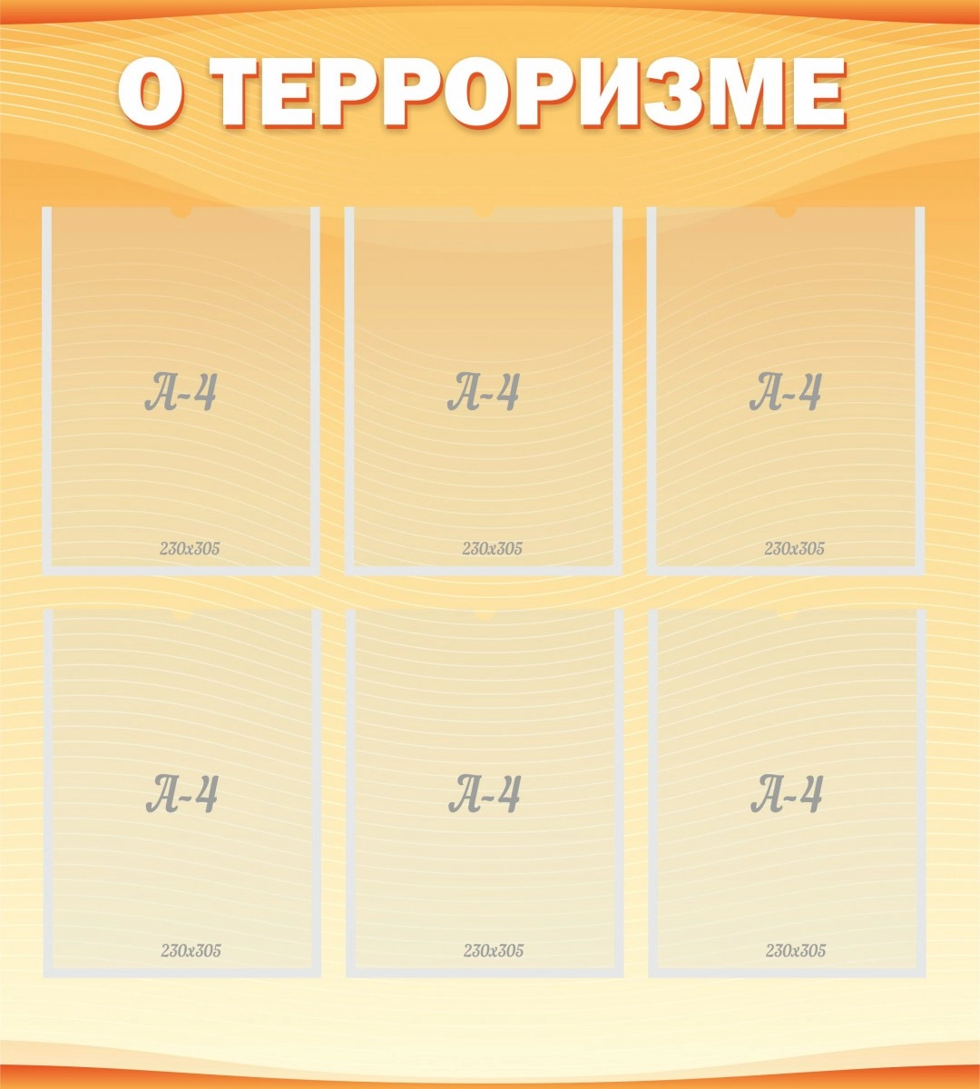 К сожалению, в современном мире все больше набирает обороты проблема терроризма. Это ужасное явление происходит во всем мире, поэтому и дети и взрослые должны знать, как поступить в такой ситуации и какие последствия терроризм приносит для общества. На данной модели стенда можно повесить любую информацию о терроризме, о его появлении, факторах и, конечно же, последствиях.