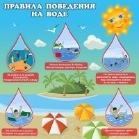 Когда летняя кампания в детском саду не за горами, стоит позаботиться о безопасности детей на воде. В ярких картинках детям и взрослым рассказываются правила поведения на водоеме. Стенд имеет пять тематических картинок, оформленных в виде большой капли в красной рамке. Информационный материал подается вместе с фоновой картинкой, на которой изображен пляж, остров с пальмами и разноцветные зонты. В верхнем углу улыбается яркое солнце, в небе летают чайки и плывут облака.