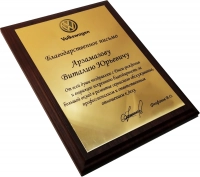 Сувенирная деревянная плакетка формата А4. Изображения и надписи, изображенные на плакетке нанесены с использованием технологии УФ-печати на металлической пластине. Используется для вручения сертификатов, почетных грамот и дипломов, благодарственных писем.