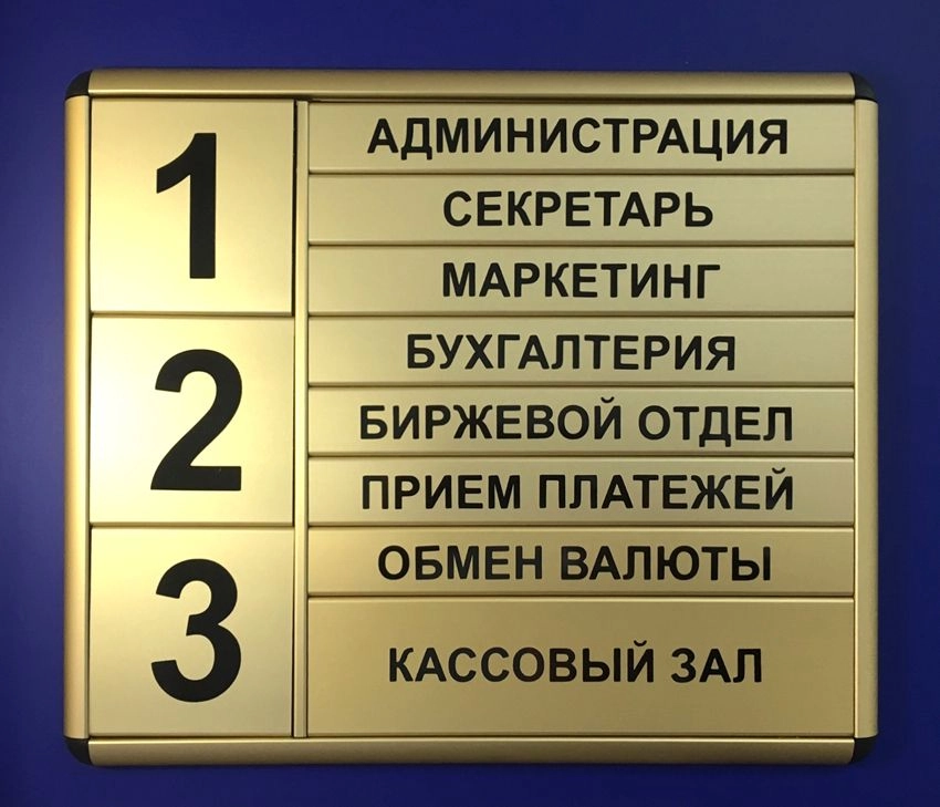 Наборное панно изготовлено с использованием текстового профиля для постоянной информации. Крепление через боковые наконечники крепятся к стене и к ним прикрепляются таблички из профиля любых размеров. Для банков, аэропортов, вокзалов, медицинских учреждений, торговых комплексов, офисов. Стоимость рассчитывается индивидуально, уточняйте у менеджера.