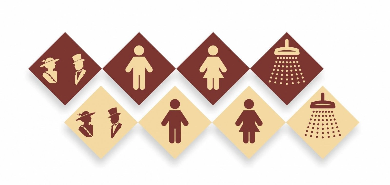 Везде есть уборные комнаты, обычно они делятся на мужские и женские.Таблички выполнены в виде ромба с изображением женщины, мужчины или душа. В случае, когда туалет совместный в табличке изображаются оба пола. Указатель изготовлен из прочного пластика ПВХ, изображение и цвет сделаны с помощью высококачественной фотопечати. В качестве защитного покрытия для таблички использовалась ламинирующая пленка. Для крепления используются обычные саморезы или скотч. Если поверхность неровная, то возможно применение специального усиленного скотча.