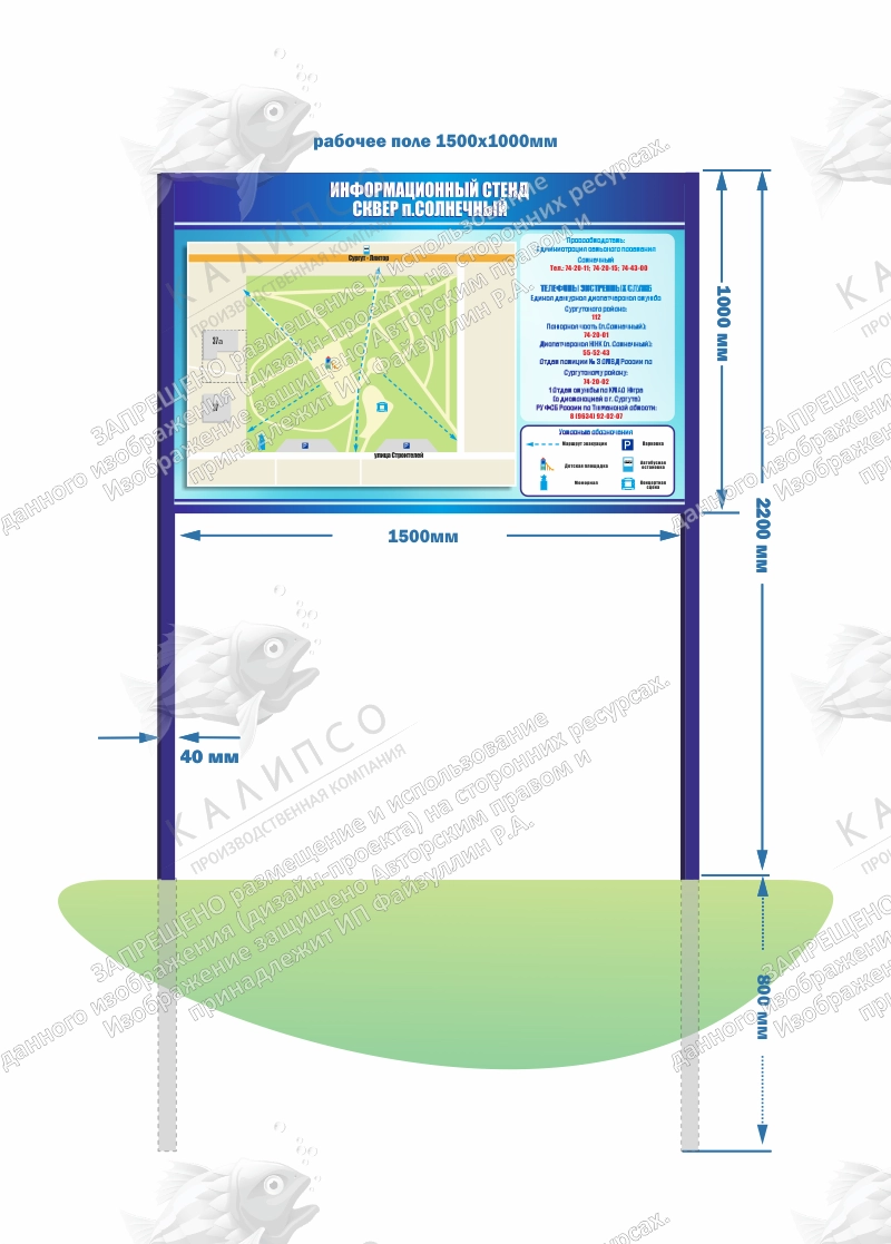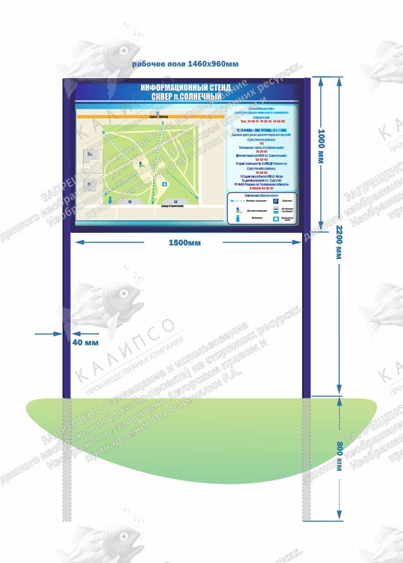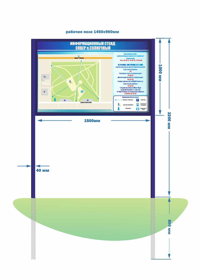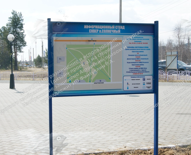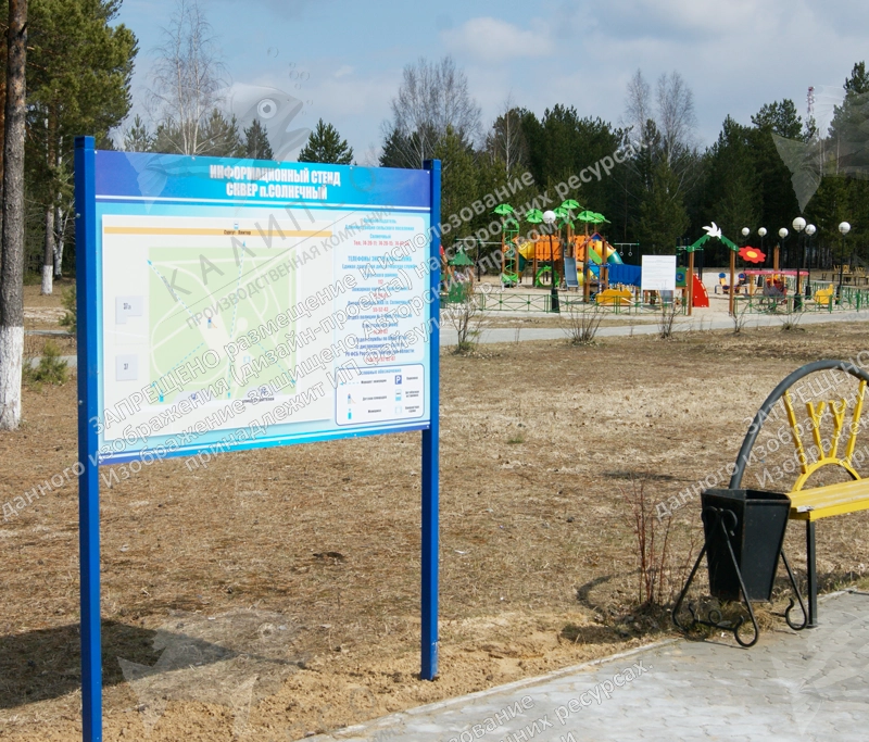 Каркас стенда выполнен из стальной профильной трубы 20*40*2мм, ножки из стальной профильной трубы 40*60*3 мм. Покраска в основные цвета грунтовка + эмаль. Панель стенда изготовлена из прочного листового алюминиевого композита толщиной 3 мм, полноцветная печать на пленке с защитной ламинацией.